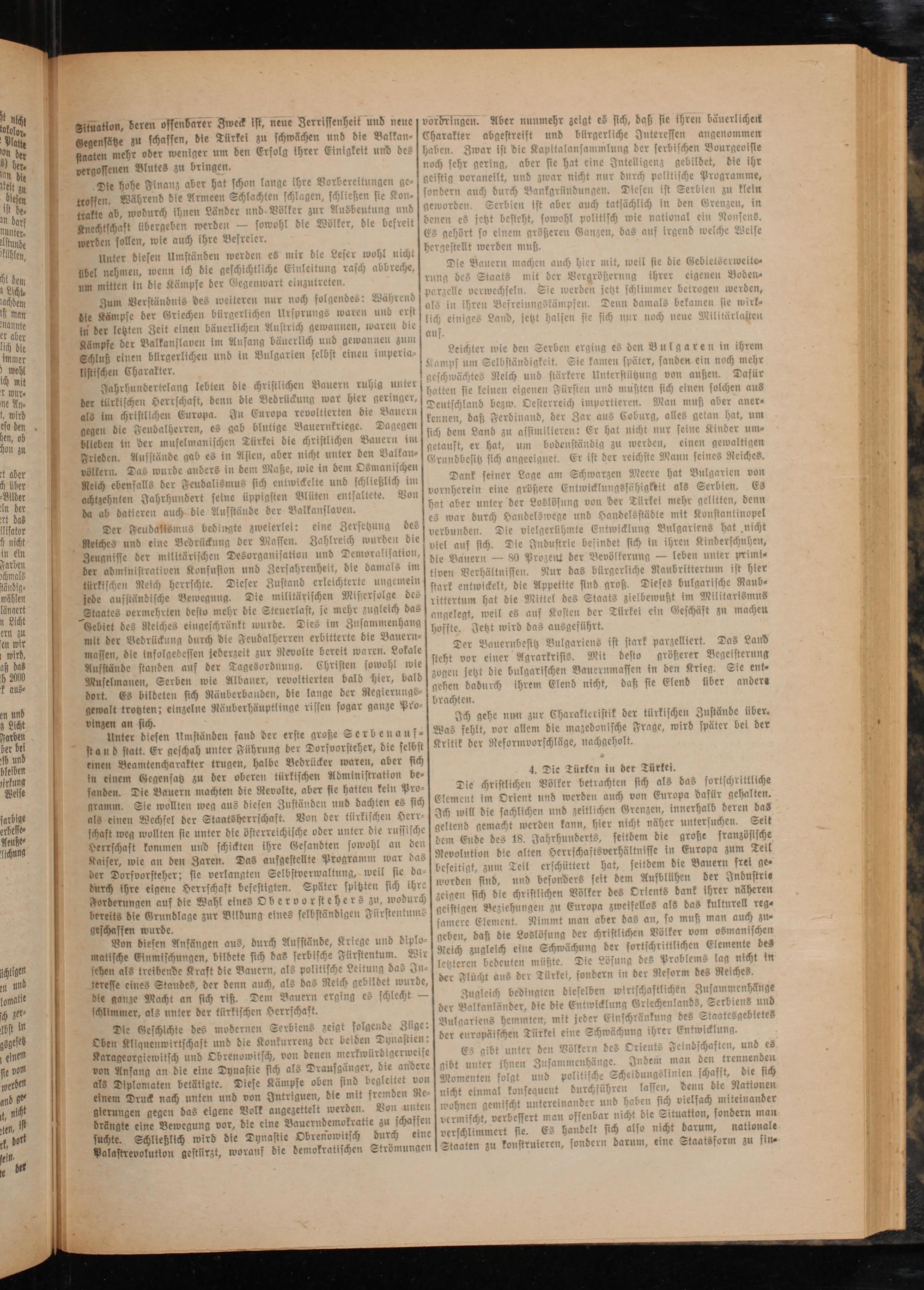 4. Die Türken in der Türkei. Die christlichen Völker betrachten sich als das fortschrittliche Element im Orient und werden auch von Europa dafür gehalten. Ich will die sachlichen und zeitlichen Grenzen, innerhalb deren das geltend gemacht werden kann, hier nicht näher untersuchen. Seit dem Eude des 18. Jahrhunderts, seitoͤem die große französische Revolution die alten Herrschaftsverhältnisse in Europa zum Teil beseitigt, zum Teil erschüttert hat, seitdem die Bauern frei ge⸗ worden sind, und besonders seit dem Aufblühen der Industrie zeigen sich die christlichen Völker des Orients dank ihrer näheren geistigen Beziehungen zu Europa zweifellos als das kulturell reg⸗ samere Element. Nimmt man aber das an, so muß man auch zu⸗ geben, daß die Losl en Völker vom osmanischen