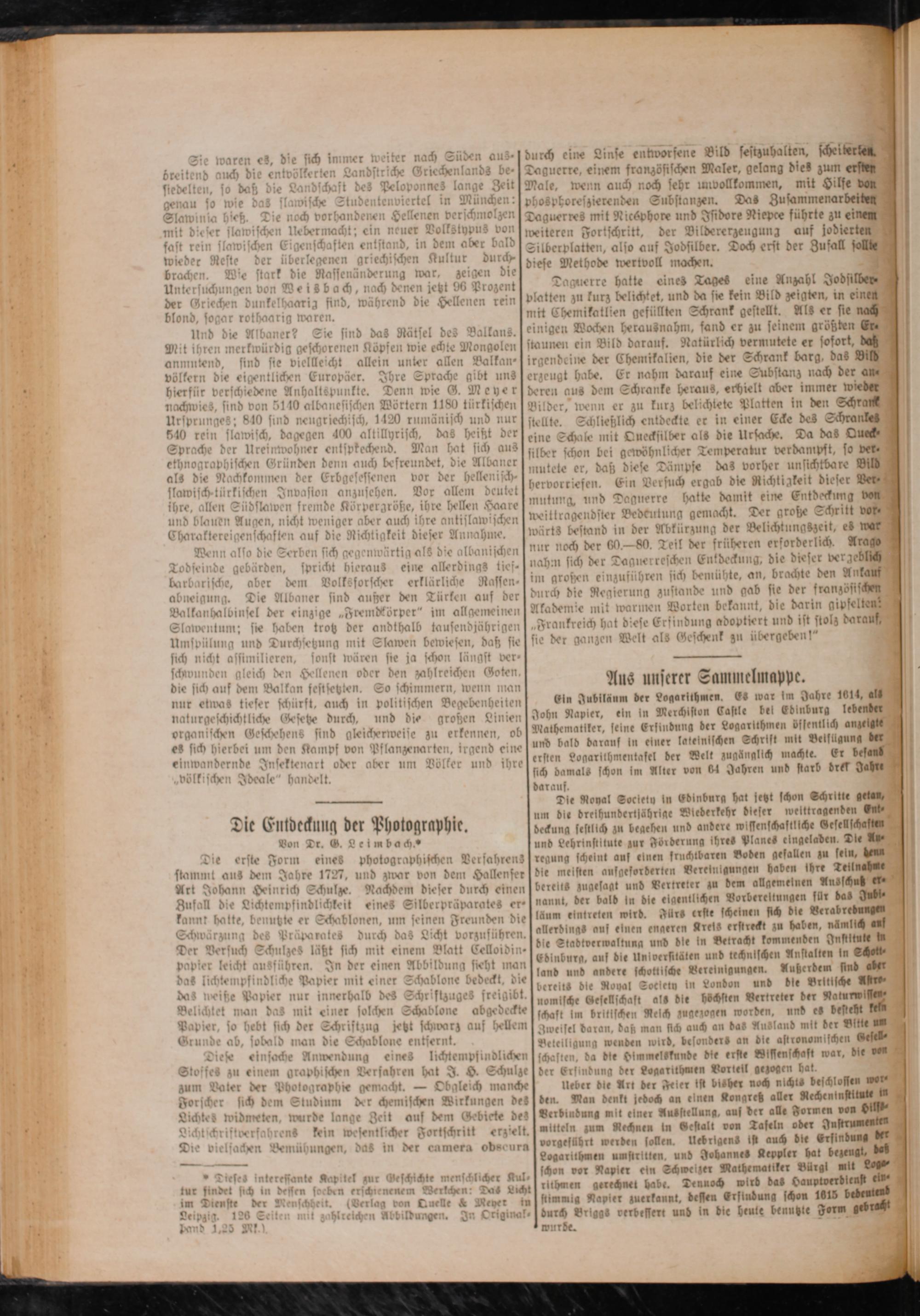 Ein Jubiläum der Logarithmen. Es war im Jahre 1614, als John Napier, ein in Merchiston Castle bel Ed burg lebender Mathematiker, seine Erfindung der Logarithmen öffentlich anzeige und bald darauf in einer lateinischen Schrift mit Beifügung der ersten Logarithmentasel der Welt zugänglich machte. Er befand ich damals schon im Alter von 64 Jahren und starb drer Jahre