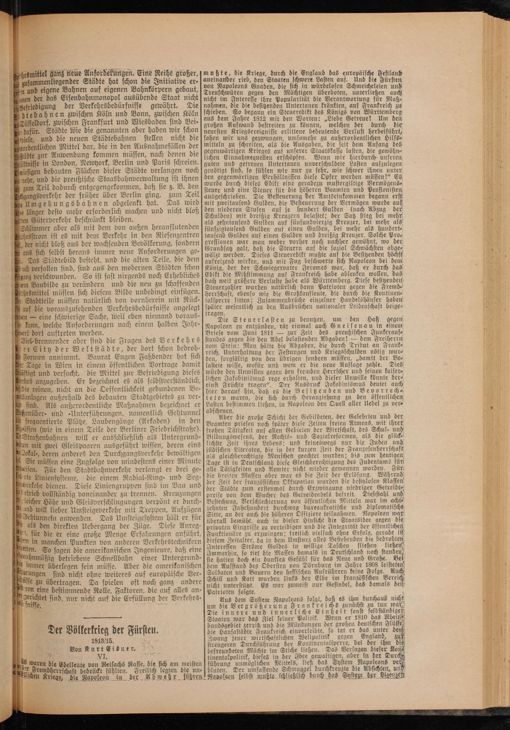 tsmittel ganz neue Anfordeküngen. Eine Reihe großer, ammenliegender Städte hat schon die Initiative er⸗ und eigene Bahnen auf eigenen Bahnkörpern gebaut, nen der das Eisenbahnmonopol ausübende Staat nicht riedigung der Verkehrsbedürfnisse gewährt. Die dtebahnen zwischen Köln und Bonn, zwischen Köln üsseldorf, zwischen Frankfurt und Wiesbaden sind Bei⸗ dafür. Städte wie die genannten aber haben wir schon ele, und die neuen Städtebahnen stellen nicht die nordentlichen Mittel dar, die in den Ausnahmefällen der kädte zur Anwendung kommen müssen, nach denen die Altnisse in London, Newyork, Berlin und Paris schreien. niesigen bebauten Flächen dieser Städte verlangen noch nehr, und die preußische Staasbahnverwaltung ist ihnen zum Teil dadurch entgegengekommen, daß sie z. B. den gangsverkehr der früher über Berlin ging, zum Teil Umgehungsbahnen abgelenkt hat. Das wird e länger desto mehr erforderlich machen und nicht bloß Güterverkehr beschränkt bleiben.