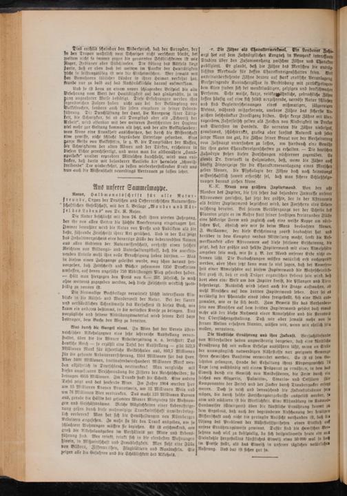 Natur, Halbmonatsschrift für alle Natur⸗ Freunde, Organ der Deutschen und Oesterreichischen Naturwissen⸗— schaftlichen Gesellschaft, mit der 5. Beilage„Wunder und Rät⸗ leldes Lebens“ von Dr. N. Rosen. ie Natur beschließt mit dem 24. Heft ihren vierten Jahrgang, der ihr von allen Seiten die höchste Anerkennung eingetragen hat Immer bewußter wird die Natur von Presse und Publikum als die beste, führende Zeitschrift ihrer Art gerühmt. Und in der Tat zeigt das Inhaltsverzeichnis eine derartige Fülle der bedeutendsten Namen aus allen Gebieten der Naturwissenschaft, verheißt einen solchen Reichtum von Bildungs- und Unterhaltungsstoff, daß die anerken— nenden Urteile wohl ihre volle Berechtigung haben dürften.— Was in diesem einen Jahrgange geleistet wurde, mag schon daraus her⸗ vorgehen, daß Zeitschrift und Bücher zusammen 1250 Druckseiten umfassen, auf denen ungefähr 750 Abbildungen Platz gefunden haben. — Hält man hiergegen den Preis von 6.— Mk. jährlich, so muß ohne weiteres zugegeben werden, daß diese Zeitschrift wirklich spott⸗ billig zu nennen ist.