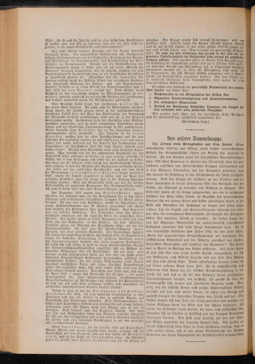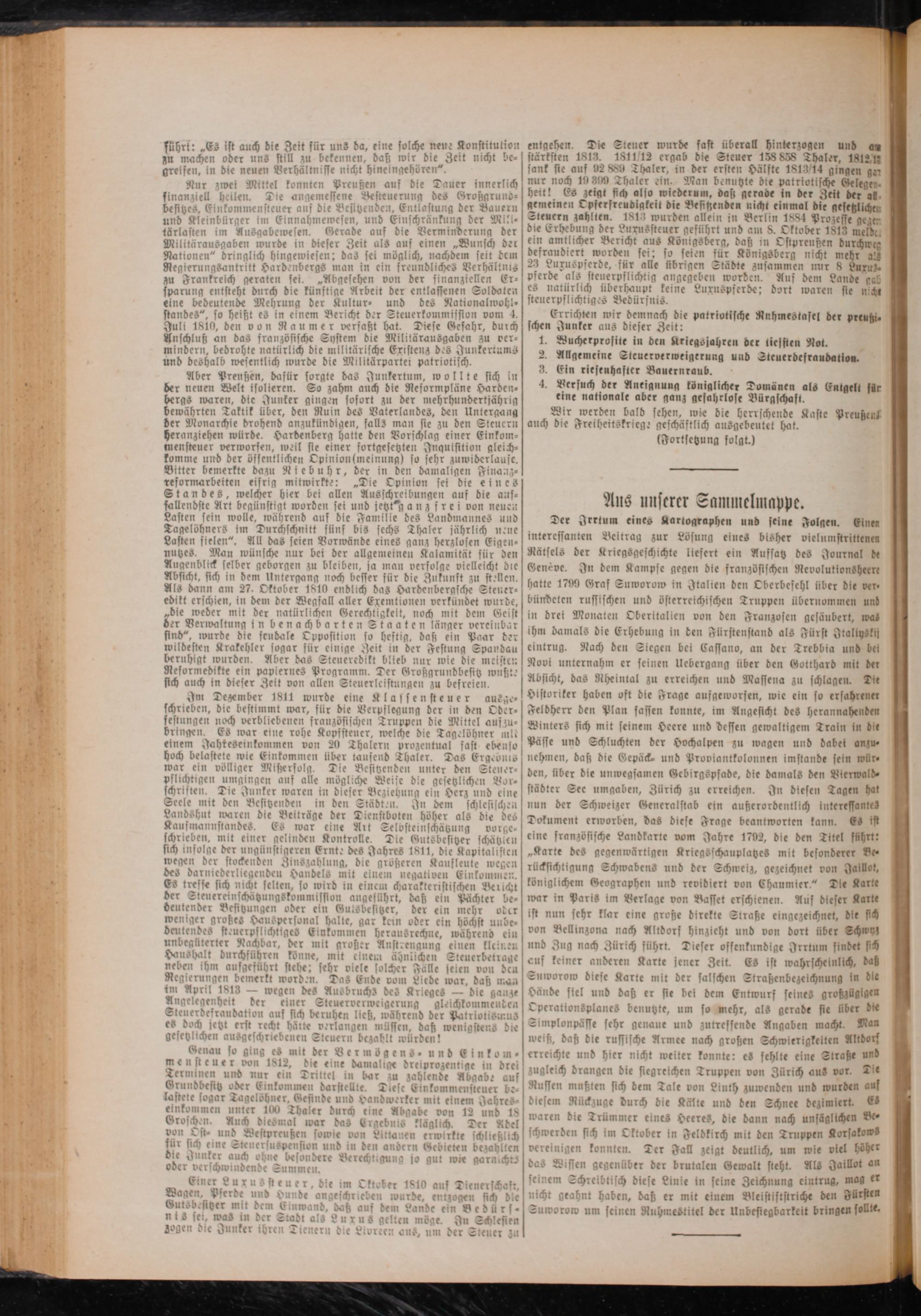 Im Dezember 1811 wurde eine Klassensteuer ausge⸗ schrieben, die bestimmt war, für die Verpflegung der in den Oder— festungen noch verbliebenen französischen Truppen die Mittel auszu⸗ bringen. Es war eine rohe Kopfsteuer, welche die Tagelöhner mit einem Jahteseinkommen von 20 Thalern prozentual fast ebenso hoch belastete wie Einkommen über tausend Thaler. Das Ergebnis war ein völliger Mißerfolg. Die Besitzenden unter den Steuer— pflichtigen umgingen auf alle mögliche Weise die gesetzlichen Vor— schrisften. Die Junker waren in dieser Beziehung ein Herz und eine Seele mit den Besitzenden in den Städten. In dem schlesischen Landshut waren die Beiträge der Dienstboten höher als die des Kaufmannstandes. Es war eine Art Selosteinschätzung vorge— schrieben, mit einer gelinden Kontrolle. Die Gutsbesitzer schätzlen sich infolge der ungünstigeren Ernte des Jahres 1811, die Kapitalisten wegen der stockenden Zinszahlung, die größeren Kaufleute wegen des darniederliegenden Handels mit einem negativen Einkommen. Es trefse sich nicht selten, so wird in einem charakteristischen Bericht der Steuereinschätzungskommission angeführt, daß ein Pächter be⸗ deutender Besitzungen oder ein Gutsbefitzer, der ein mehr oder weniger großes Hauspersonal halte, gar kein oder ein höchst unbe⸗ deutendes steuerpflichtiges Einkommen he rausrechne, während ein unbegüterter Nachbar, der mit großer Anstrengung einen klcinen Haushalt durchführen könne, mit einem ähnlichen Steuerbetrage neben ihm aufgeführt stehe; sehr viele solcher Fälle seien von den Regierungen bemerkt worden. Das Ende vom Liede war, daß man im April 1813— wegen des Ausbruchs des Krieges— die ganze Angelegenheit der einer Steuerverweigerung gleichkommenden Steuerdefraudation auf sich beruhen ließ, während der Patriotismus es doch jetzt erst recht hätte verlangen müssen, daß wenigstens die gesetzlichen ausgeschriebenen Steuern bezahlt würden!