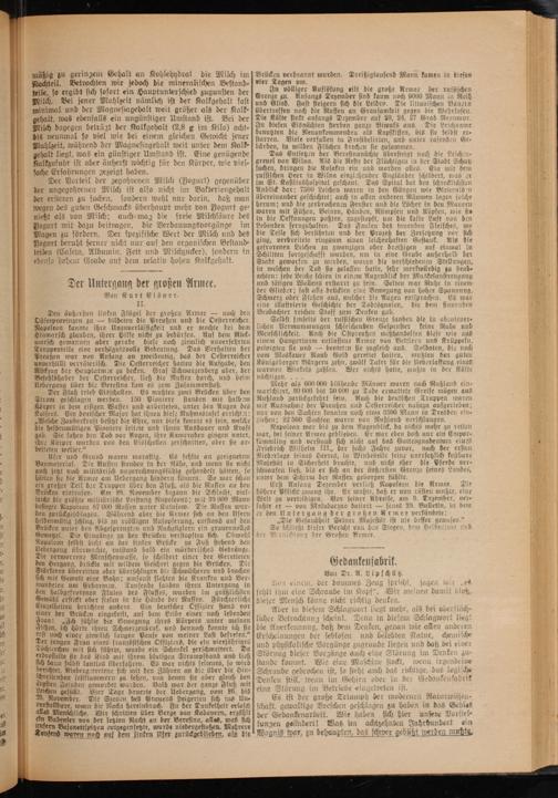 Das Entsetzen der Beresinanächte übersteigt noch die Leichen greuel von Wilna. Als die Reste der Flüchtigen in der Stadt Schutz suchen, dringen die Kosaken ein und morden alles. Ein mit dem russischen Heer in Wilna einziehender Engländer schildert, was er im St. Kasiliushospital geschaut. Das Spital bot den schrecklichsten Anblick dar: 7500 Leichen waren in den Gängen wie Bleimuld em übereinander geschichtet; auch in allen anderen Räumen lagen solche herum; und die zerbrochenen Fenster und die Löcher in den Mauern waren mit Füßen, Beinen, Händen, Rümpfen und Köpfen, wie sie in die Oeffnungen paßten, zugestopft, um die kalte Luft von den Lebenden fernzuhalten. Das Faulen des tauenden Fleisches, wo die Teile sich berührten und der Prozeß ber Zersetzung vor sich ging, verbreitete ringsum einen leichenhaften Gestaunk. Als die gefrorenen Leichen zu zwanzigen oder dreißigen auf einmal in Schlitten fortgeschafft wurden, um in eine Grube außerhalb der Stadt geworfen zu werden, waren die verschiedenen Stellungen, in welchen der Tod sie gelassen hatte, sehr merkwilrdig zu beob- achten: jede Leiche schien in einem Augenblick der Muskelanstrengung und tätigen Wollens erstarrt zu sein. Selten war Ruhe in einem der Glieder; fast alle drückten eine Bewegung von hoher Spannung, Schmerz oder Flehen aus, welcher dle Augen entsprachen. Es war eine illustrierte Geschichte der Todesqualen, die dem sinnenden Beobachter reichen Stoff zum Denken gab.
