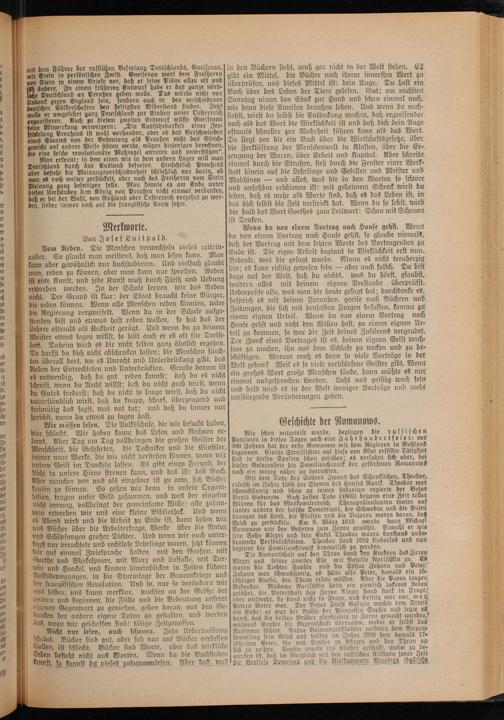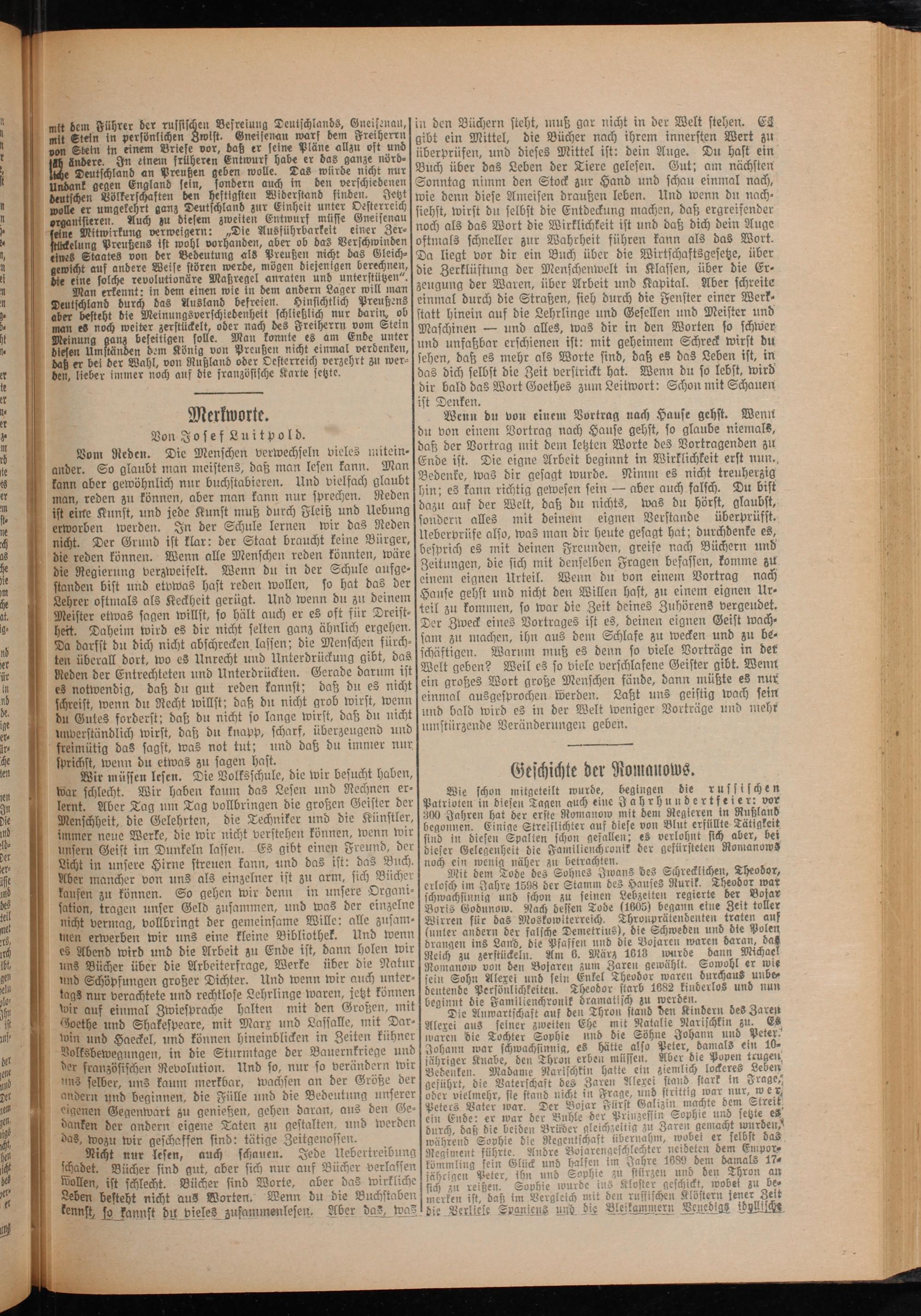 te dir bald das Wort Goethes zum Leitwort: Schon mit Schauen 1 ist Denken. 5 Merkworte Wenn du von einem Vortrag nach Hause gehst. Wenn er f* 0 1 . Von Josef Luitpold. du von einem Vortrag nach Hause gehst, so glaube niemals, 0 Vom Reden. Die Menschen verwechseln vieles mitein— daß der. 5 1 0 1 0. zu le ander. So glaubt man meistens, daß man lesen kann. Man Ende ist. Die eigne Arbeit benin in wirklin erf 154 15 5 kann aber gewöhnlich nur buchstabieren. Und vielfach glaubt Bedenke was dir gesagt wurde. Nimm es nicht treuherzig 8 man, reden zu können, aber man kann nur sprechen. Reden hin; es kann ragte gewesen sein—aber auch falsch. Du bist l ist eine Kunst, und jede Kunst muß durch Fleiß und Uebung dazu auf der Welt, daß du nichts, 957 n 1 0 erworben werden. In der Schule lernen wir das Reden sondern alles mit deinem Bae ers ande 5 0 nicht. Der Grund ist klar: der Staat braucht keine Bürger, Ueberprüfe also, was man dir heute gesagt hat durch enke es 15 die reden können. Wenn alle Menschen reden könnten, wäre besprich es mit deinen Freunden, greife nach Büchern und 0 die Regierung verzweifelt. Wenn du in der Schule aufge⸗ Zeitungen, die sich mit denselben Fragen befassen, komme zu 155 standen bist und etvwas hast reden wollen, so FFF Urteil. Wen du 8 einem Vortrag 7 he Lehrer oftmals als Keckheit gerügt. Und wenn du zu deinem Hause gehst und nicht den,. hast, zu einem eignen. r⸗ l. Meister etwas sagen willst, so hält auch er es oft für Dreist⸗ teil zu kommen, so war 5 Zeit deines Zuhörens vergeu 5 1. heit. Daheim wird es dir nicht selten ganz ähnlich ergehen.] Der Zweck N Vortrages ist 85 deinen 9 070 Geist 1 10 Da darfst du dich nicht abschrecken lassen; die Menschen fürch.] sam zu N Fw 1 3 und zu 55 er ten überall dort, wo es Unrecht und Unterdrückung gibt, das schäftigen. Warum muß es denn so viele Zorträge in der ür Reden der Entrechteten und Unterdrückten. Gerade darum ist Welt geben? Weil es so viele verschlafene Geister gibt. Wenn in es notwendig, daß du gut reden kannst; daß du es nichtsein großes Wort große Menschen fände, dann müßte es nur 5 schreist, wenn du Recht willst; daß du nicht grob wirst, wenn einmal ausgesprochen werden. Laßt uns geistig wach sein 1 du Gutes forderst; daß du nicht so lange wirst, daß du nicht und bald in es in der Welt weniger Vorträge und mehr et⸗ unperständlich wirst, daß du knapp, scharf, überzeugend und umstürzende Veränderungen geben. . freimütig das sagst, was not tut; und daß du immer nur.. che sprichst, wenn du etwas zu sagen hast.* n ö 8 Wir müssen lesen. Die Volksschule, die wir besucht haben, Geschichte der Romauows. War schlecht. Wir haben kaum das Lesen und Rechnen er— Wie schon mitgeteilt wurde, begingen die russischen 90 lernt. Aber Tag um Tag vollbringen die großen Geister der] Patrioten 8 diesen Tagen auch eine J a 8 ndertfeier: vor e Menschheit, die Gelehrten, die Techniker und die Künstler, 300 Jahren hat der ersse Romauow mit dem Alen era 8 0 immer neue Werke, die wir nicht verstehen können, wenn wir F e n 5 8 N bei der unsern Geist im Dunkeln lassen. Es gibt einen Freund der] diefer Gelegenheit die Familienchronik der gefürsteten Romanows er⸗ Licht in unsere Hirne streuen kann, und das ist: das Buch.] noch ein wenig näher zu betrachten. se Aber mancher von uns als einzelner ist zu arm, sich Bücher Mit dem Tode des Sohnes Jwans des 3 3 8 ee benen Es geben wie dem in unfere ron aten ente ger legen deze eee dee def 1 ation, tragen unser Geld zusammen, und was der einzelne Boris Godunow. Kach dessen Tode(1605) begann eiue Zeit toller 1 5 nicht vermag, vollbringt der gemeinsame Wille: alle zusam⸗] Wirren für das Moskowiterreich. Thronprätendenten traten auf 1 15 men erwerben wir uns eine kleine Bibliothek. Und wenn unter andern der falsche Demetrius), 1 Schweden 1* 8 ich es Abend wird und die Arbeit zu Ende ist, dann holen wir F 3 1 af g 5 5 uns Bücher über die Arbeiterfrage, Werke über die Natur Romanow von den Bolaren zum Zaren gewählt. Sowohl er wie ö 1155 und Schöpfungen großer Dichter. Und wenn wir auch unter⸗[sein Sohn Alexei und sein Enkel Theodor waren durchaus unbe⸗ 1 1 tags nur verachtete und rechtlose Lehrlinge waren, jetzt können. 5 E und nun N 0 5 wir auf einmal Zwiesprache halten mit den Großen, mit 85 Anwartschaft 1 Thron stand den Kindern des Zaren 1 it Goethe und Shakespeare, mit Marx und Lassalle, mit Dar- Alexei aus seiner zweiten Ehe mit Natalie Narischkin zu. Es 1 . win und Haeckel, und können hineinblicken in Zeiten kühner] waren die Tochter Sophie und die Söhne Johann und Peter.. 11 Bolksbewegungen, in die Sturmtage der Bauernkriege und Jehan. 5 1 f 1 0 2 französischen Revolution. Und so, 20 so verändern 1 Bedenken. me Narischktin hatte ein ziemlich lockeres Leben as selber, uns kaum merkbar, wachsen an der Größe der] geführt, die Vaterschaft des Zaren Alexei staud stark in Frage, 1. andern und beginnen, die Fülle und die Bedeutung unserer oder vielmehr, sie stand nich in Naa 1 1 5 2 5„ Fe- 83 V 1 D Bo Für Balizit S 1 10 1 3 Gegenwart zu genießen, gehen daran, 3 5 ze 5 N 5 ele Eeppie urs ecke es ö 0 danken der andern eigene Taten zu gestalten, und werden durch daß die beiden Brüder gleichzeitig zu Zaren gemacht W 1 . das, wozu wir geschaffen sind: tätige Zeitgenossen. während Sophie die Regentschaft übernahm, wobei er selbst das 1 00 Nicht nur lesen, auch schauen. Jede Uebertreibung] Regiment führte. Andre Bojarengeschlechter neideten dem Empor⸗ 1 t schadet. Bücher sind gut, aber sich nur auf Bücher verlassen kömmling sein Gläick und Lalfen im Achreen and 7e damals 17. 1 eden wic dead werte abe d wiege eg een Seele de ae ee, were nec 1 15 0 Leben besteht nicht aus Worten. Wenn du die Buchstaben 5 1 ist, daß im Vergleich mit den rufsischen Klöstern jener Zeit 1 N 3 kenn die Verliese Sranieus und die Bleikammern Veuedigs idullllche N