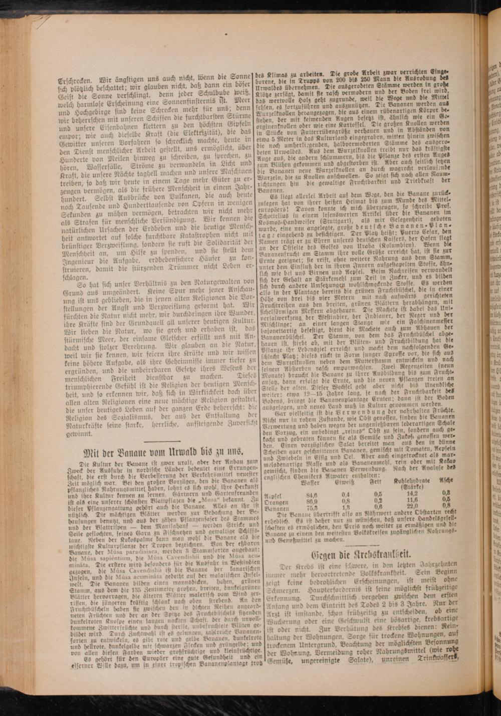 Die Banane übertrifft also an Nährwert andere Obstarten recht erheblich. Es ist daher nur zu wirnschen, daß unsere Handelsgesell⸗ schaften es ermöglichen, den Preis noch weiter zu ermäßigen und die Banane zu einem den weitesten Volkskreisen zugänglichen Nahrungs⸗ und Genußmittel zu machen.