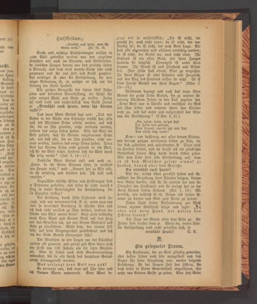 „Erwählt euch heute, wem ihr 5 dienen wollt.“ Jos. 24, 15. Sroße unb wichtige Entscheidungen müssen in teser Welt getroffen werden von den einzelnen Nenschen wie auch im Staaten⸗ und Völkerleben. u irdischen Fragen kommt nur das zeitliche Leben u Betracht, und doch wird manche Sache sehr ernst