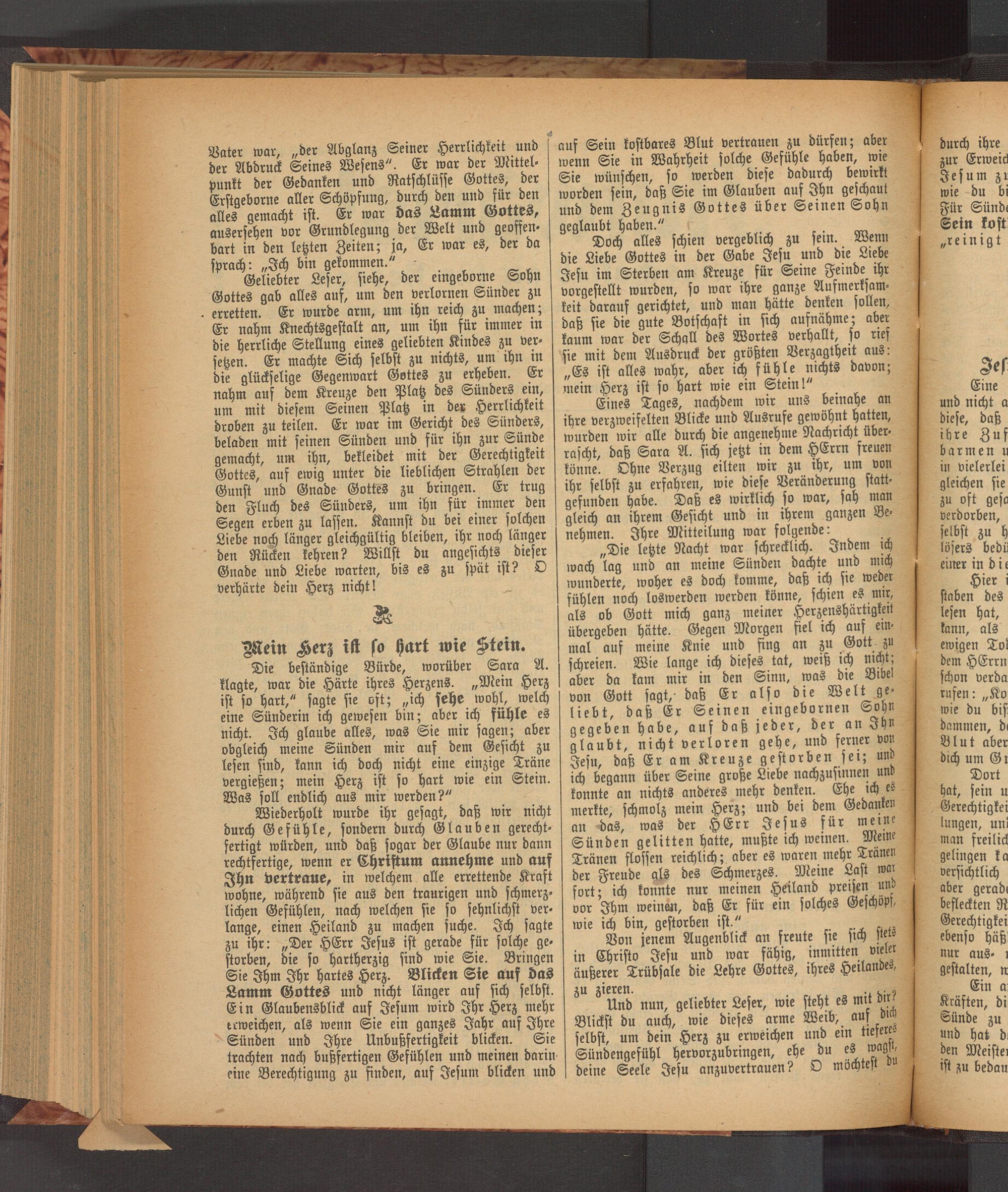„Die letzte Nacht war schrecklich. Indem ich wach lag und an meine Sünden dachte und mich wunderte, woher es doch komme, daß ich sie weder fühlen noch loswerden werden könne, schien es mir, als ob Gott mich ganz meiner Herzenshärtigkeit übergeben hätte. Gegen Morgen fiel ich auf ein⸗ mal auf meine Knie und fing an zu Gott zu schreien. Wie lange ich dieses tat, weiß ich nicht; aber da kam mir in den Sinn, was die Bibel von Gott sagt, daß Er also die Welt ge⸗ liebt, daß Er Seinen eingebornen Sohn gegeben habe, auf daß jeder, der an Ihn glaubt, nicht verloren gehe, und ferner von Jesu, daß Er am Kreuze gestorben sei; und ich begann über Seine große Liebe nachzusinnen und konnte an nichts anderes mehr denken. Ehe ich es merkte, schmolz mein Herz; und bei dem Gedanken an das, was der HErr Jesus für meine Sünden gelitten hatte, mußte ich weinen. Meine Tränen flossen reichlich; aber es waren mehr Tränen der Freude als des Schmerzes. Meine Last war fort; ich konnte nur meinen Heiland preisen und vor Ihm weinen, daß Er für ein solches Geschöpf, wie ich bin, gestorben ist.“ e