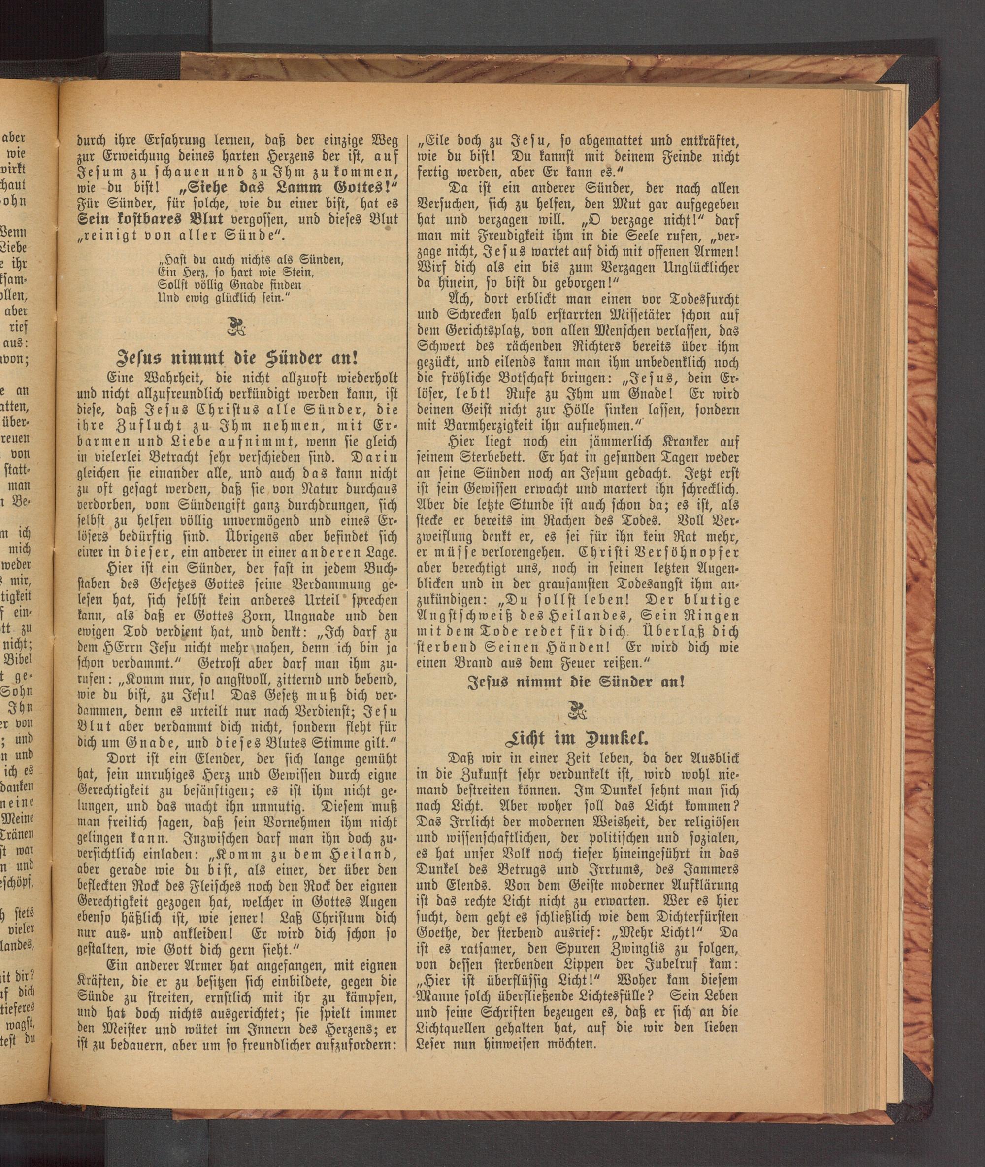 Daß wir in einer Zeit leben, da der Ausblick in die Zukunft sehr verdunkelt ist, wird wohl nie⸗ mand bestreiten können. Im Dunkel sehnt man sich nach Licht. Aber woher soll das Licht kommen? Das Irrlicht der modernen Weisheit, der religiösen und wissenschaftlichen, der politischen und sozialen, es hat unser Volk noch tiefer hineingesührt in das Dunkel des Betrugs und Irrtums, des Jammers und Elends. Von dem Geiste moderner Aufklärung ist das rechte Licht nicht zu erwarten. Wer es hier sucht, dem geht es schließlich wie dem Dichterfürsten Goethe, der sterbend ausrief:„Mehr Licht!“ Da ist es ratsamer, den Spuren Zwinglis zu folgen, von dessen sterbenden Lippen der Jubelruf kam: „Hier ist überflüssig Licht!“ Woher kam diesem Manne solch überfließende Lichtesfülle? Sein Leben und seine Schriften bezeugen es, daß er sich an die Lichtquellen gehalten hat, auf die wir den lieben Leser nun hinweisen möchten.
