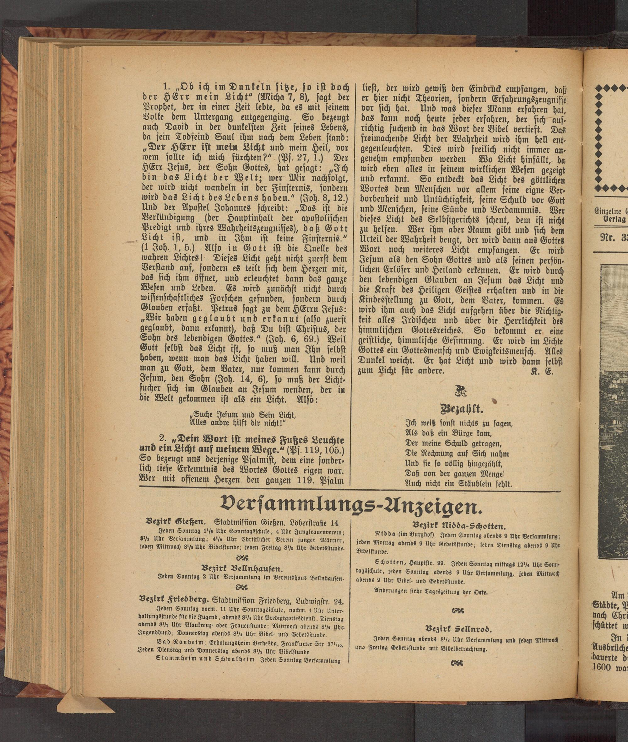 Bezirk Nidda Schotten. Nidda(im Burghof). Jeden Sonntag abends 9 Uhr Versammlung; jeden Montag abends 9 Uhr Gebetsstunde; ieden Dienstag abends 9 Uhr Bibelstunde.