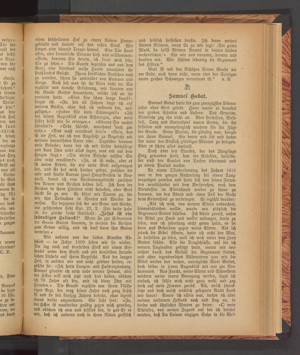 Samuel Gobat hatte bis zum zwanzigsten Lebens⸗ jahre ohne Gott gelebt. Zwar wurde er bewahrt vor groben Sünden und Lastern. Das Gemeine, Sinnliche zog ihn nicht an. Aber Leichtsinn, Welt⸗ lust, Tanz und Kartenspiel waren Ketten, die ihn fesselten und unempfänglich machten für die Züge der Gnade. Seine Mutter, die gläubig war, bangte um ihren Samuel. Sie betete und litt und suchte ihn unter den Einfluß gläubiger Männer zu bringen. Aber es schien alles umsonst.