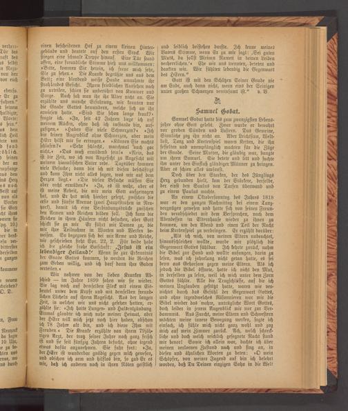 „Als ich mich, von meinen Eltern unbeachtet, hinausschleichen wollte, wurde mir plötzlich die Gegenwart Gottes fühlbar. Ich kehrte zurück, nahm die Bibel zur Hand und wollte anfangen, darin zu lesen, was ich jahrelang nicht getan hatte, es sei denn aus Gehorsam gegen meine Eltern. Als ich jedoch die Bibel öffnete, hatte ich nicht den Mut, in derselben zu lesen, weil ich mich unter dem Zorn Gottes fühlte. Alle die Trugschlüsse, auf die ich meinen Unglauben gestützt hatte, waren wie ver⸗ nichtet durch das Gefühl der Gegenwart Gottes, und ohne irgendwelches Räsonnieren war mir die Bibel wieder das wahre, untrügliche Wort Gottes, doch leider in jenem Augenblick mir nur zur Ver⸗ dammnis. Aus Furcht, meine Eltern und Schwestern möchten meine innere Bewegung merken, sagte ich einfach, ich fühle mich nicht ganz wohl und zog mich auf mein Zimmer zurück. Ach, welch schreck⸗ liche und doch welch reichlich gesegnete Nacht stand mir bevor! Sowie ich allein war, dachte ich über meinen verlornen Zustand nach und fing an, in diesen und ähnlichen Worten zu beten:»O mein Schöpfer, von meiner Jugend auf bin ich belehrt worden, daß Du Deinen einzigen Sohn in die Welt