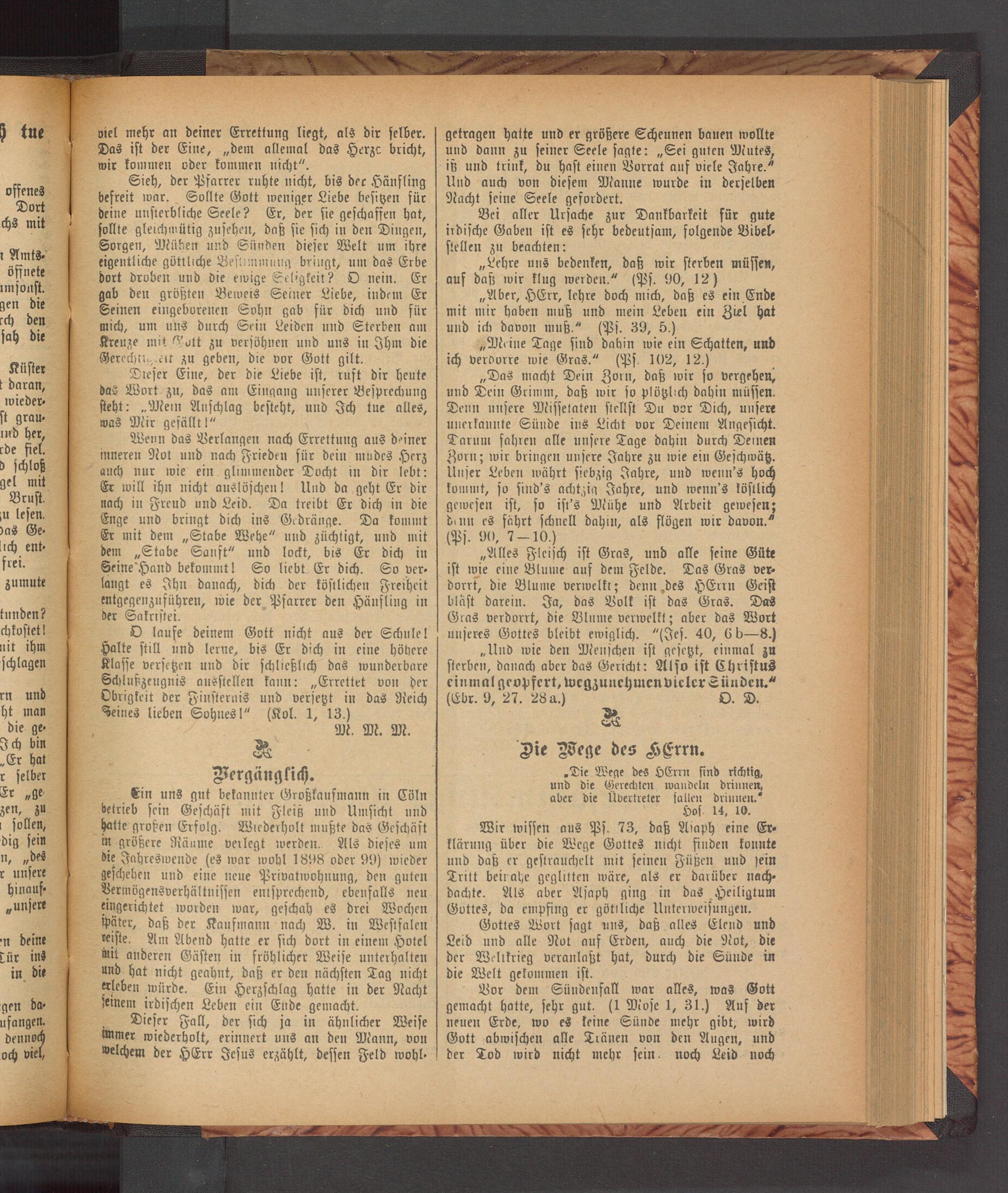 Ein uns gut bekannter Großkaufmann in Cöln betrieb sein Geschäft mit Fleiß und Umsicht und hatte großen Erfolg. Wiederholt mußte das Geschäft in größere Räume verlegt werden. Als dieses um die Jahreswende les war wohl 1898 oder 99) wieder geschehen und eine neue Privatwohnung, den guten Vermögensverhältnissen entsprechend, ebenfalls neu eingerichtet worden war, geschah es drei Wochen später, daß der Kaufmann nach W. in Westfalen teiste. Am Abend hatte er sich dort in einem Hotel mit anderen Gästen in fröhlicher Weise unterhalten und hat nicht geahnt, daß er den nächsten Tag nicht erleben würde. Ein Herzschlag hatte in der Nacht einem irdischen Leben ein Ende gemacht. Dieser Fall, der sich ja in ähnlicher Weise immer wiederholt, erinnert uns an den Mann, von welchem der HErr Jesus erzählt, dessen Feld wohl