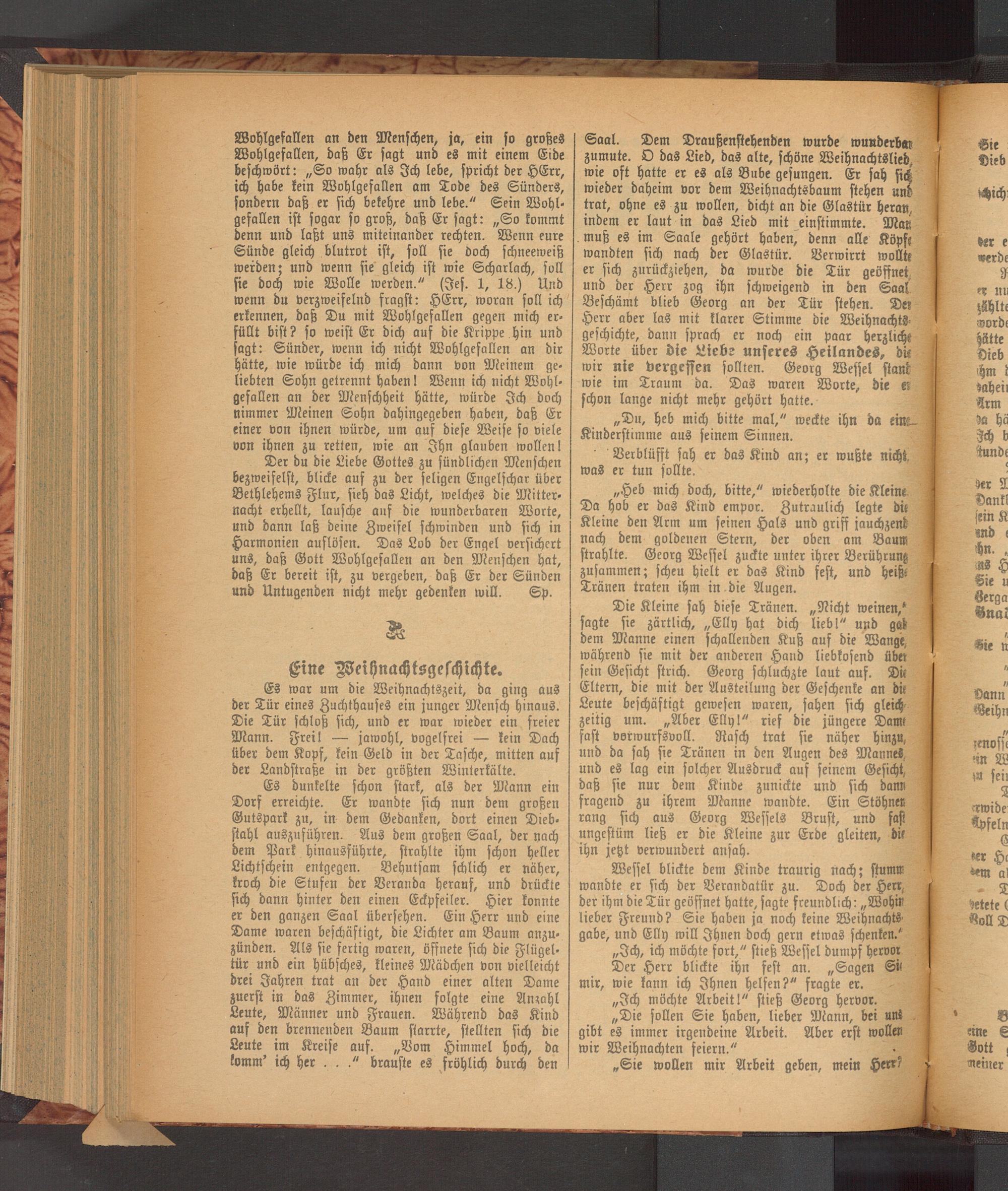 nacht erhellt, lausche auf die wunderbaren Worte, Da hob er das Kind empor. Zutraulich legte dit ein K und dann laß deine Zweifel schwinden und sich in] Kleine den Arm um seinen Hals und griff iaucgze and Harmonien auflösen. Das Lob der Engel versichert nach dem goldenen Stern, der oben 2 Baum ihn. uns, daß Gott Wohlgefallen an den Menschen hat, strahlte. Georg Wessel zuckte er ihrer Berührung 48 5 daß Er bereit ist, zu vergeben, daß Er der Sünden zusammen; scheu hielt er das Kind fest, und heiß, Sie u und Untugenden nicht mehr gedenken will. Sp. Tränen traten ihm in die Augen. ö Berga Die Kleine sah diese Tränen.„Nicht weinen, Ina 5 sagte sie zärtlich,„Elly hat dich lieb!“ und gas N dem Manne einen schallenden Kuß auf die Wange, i 5 während sie mit der anderen Hand liebkosend üben Eine Weihnachtsgeschichte. sein Gesicht strich. Georg schluchzte laut auf. Dit 5 Es war um die Weihnachtszeit, da ging aus Eltern, die mit der Austeilung der Geschenke an di Daun der Tür eines Zuchthauses ein junger Mensch hinaus. Leute beschäftigt gewesen waren, sahen sich gleich Weihn Die Tür schloß sich, und er war wieder ein freier zeitig um.„Aber Elly!“ rief die jüngere Dam 5 Mann. Frei!— jawohl, vogelfrei— kein Dach fast vorwurfsvoll. Rasch trat sie näher hinzu, zenosse über dem Kopf, kein Geld in der Tasche, mitten auf und da sah sie Tränen in den Augen des Manne, in W der Landstraße in der größten Winterkälte. und es lag ein solcher Ausdruck auf seinem Gesicht, iu sein Es dunkelte schon stark, als der Mann ein daß sie nur dem Kinde zunickte und sich dann a 2 Dorf erreichte. Er wandte sich nun dem großen fragend zu ihren Manne wandte. Ein Stöhnen wide Gutspark zu, in dem Gedanken, dort einen Dieb. rang sich aus Georg Wessels Brust, und faf Apfeln stahl auszuführen. Aus dem großen Saal, der nach ungestüm ließ er die Kleine zur Erde gleiten, dil 8 dem Park hinausführte, strahlte ihm schon heller ihn jetzt verwundert ansah. f zer He Lichtschein entgegen. Behutsam schlich er näher, Wessel blickte dem Kinde traurig nach; stum dem a kroch die Stufen der Veranda herauf, und drückte wandte er sich der Verandatür zu. Doch der Hert, sich dann hinter den einen Eckpfeiler. Hier konnte der ihm die Tür geöffnet hatte, sagte freundlich:„Wohin betete( er den ganzen Saal übersehen. Ein Herr und eine lieber Freund? Sie haben ja noch keine Weihnachts Noll D Dame waren beschäftigt, die Lichter am Baum anzu- gabe, und Elly will Ihnen doch gern etwas schenken.“ zünden. Als sie fertig waren, öffnete sich die Flügel.„Ich, ich möchte fort,“ stieß Wessel dumpf hervor tür und ein hübsches, kleines Mädchen von vielleicht Der Herr blickte ihn fest an.„Sagen Sit drei Jahren trat an der Hand einer alten Dame mir, wie kann ich Ihnen helfen?“ fragte er. zuerst in das Zimmer, ihnen folgte eine Anzahl„Ich möchte Arbeit!“ stieß Georg hervor. Leute, Männer und Frauen. Während das Kind„Die sollen Sie haben, lieber Mann, bei uns 58 auf den brennenden Baum starrte, stellten sich die gibt es immer irgendeine Arbeit. Aber erst wollen eine S Leute im Kreise auf.„Vom Himmel hoch, da wir Weihnachten feiern.“ 1 Bott komm' ich her...“ brauste es fröhlich durch den„Sie wollen mir Arbeit geben, mein Herr; meiner