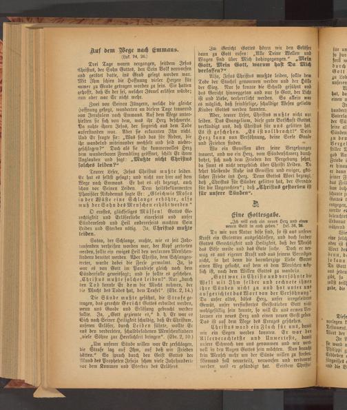 Zwei von Seinen Jüngern, welche die gleiche Hoffnung gehegt, wanderten an diesem Tage trauernd von Jerusalem nach Emmaus. Auf dem Wege unter⸗ hielten sie sich von dem, was ihr Herz beschwerte. Da nahte ihnen Jesus, der siegreich aus dem Tode auferstanden war. Aber sie erkannten Ihn nicht. Und Er fragte sie:„Was sind das für Reden, die ihr wandelnd miteinander wechselt und seid nieder⸗ geschlagen?“ Doch als sie ihr kummervolles Herz dem wunderbaren Fremdling geöffnet, schilt Er ihren Unglauben und sagt:„Mußte nicht Christus solches leiden?“
