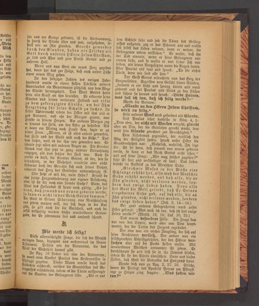 dir: Es sei denn, daß jemand von neuem geboren werde, so kann er das Reich Gottes nicht sehen,“ und auf seine Frage:„Wie mag solches zugehen?“ fuhr Er fort und verkündigte es laut: Das Leben besteht im Aufblick zu des Menschen Sohn. „Gleichwie Moses in der Wüste eine Schlange erhöht hat, al so muß des Menschen Sohn erhöht werden, auf daß alle, die an Ihn glauben, nicht verloren werden, son⸗ dern das ewige Leben haben. Denn also hat Gott die Welt geliebt, daß Er Seinen eingebornen Sohn gab, auf daß alle, die an Ihn glauben, nicht verloren werden, son dern das ewige Leben haben.“(Joh. 3, 14—16.) Bei zwei anderen Gelegenheiten ward unser HErr gefragt:„Was muß ich tun, daß ich das ewige Leben ererbe?“(Matth. 19, 16; Luk. 10, 25.) Das waren besondere Fälle. Die Frage kam nur von den Lippen, ward aber von Dem beant⸗ wortet, der die Tiefen des Herzens ergründet. Der eine war ein reicher Jüngling, der sich auf seine Reichtümer verließ. Der andere war ein selbstgerechter Schriftgelehrter, der den HErrn ver⸗ suchen oder auf die Probe stellen wollte. Mit wunderbarer Weisheit antwortete Er jedem. Er durchschaute sie und ließ sie in ihr Inneres blicken, indem Er sie der Sünde überführte. Lerne aus diesen