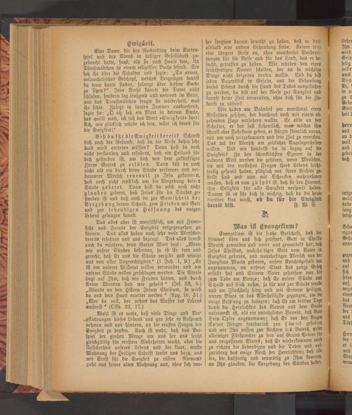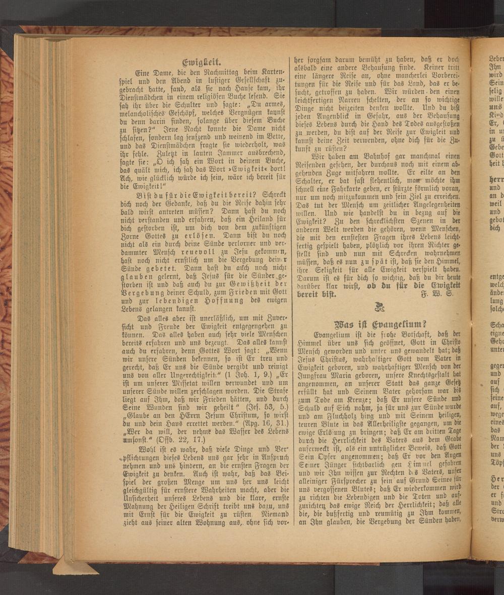 Eine Dame, die den Nachmittag beim Karten⸗ spiel und den Abend in lustiger Gesellschaft zu⸗ gebracht hatte, fand, als sie nach Hause kam, ihr Dienstmädchen in einem religiösen Buche lesend. Sie sah ihr über die Schulter und sagte:„Du armes, melancholisches Geschöpf, welches Vergnügen kaunst du denn darin finden, solange über diesem Buche zu sitzen?“ Jene Nacht konnte die Dame nicht schlafen, sondern lag seufzend und weinend im Bette, und das Dienstmädchen fragte sie wiederholt, was ihr fehle. Zuletzt in lauten Jammer ausbrechend, sagte sie:„O ich sah ein Wort in deinem Buche, das quält mich, ich sah das Wort»Ewigkeit« dort! Ach, wie glücklich würde ich sein, wäre ich bereit für die Ewigkeit!“