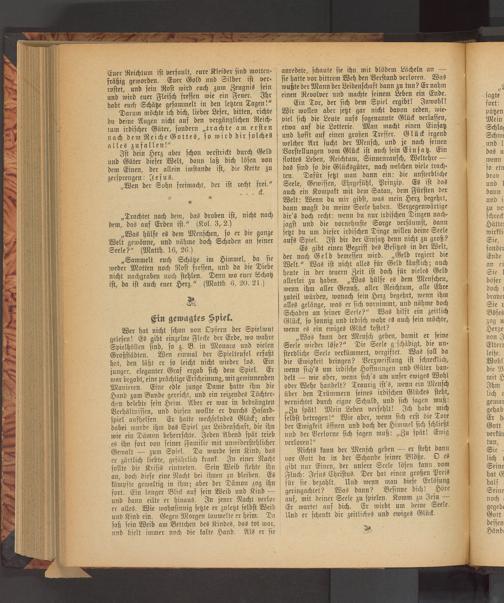 gelesen! Es gibt einzelne Flecke der Erde, wo wahre Spielhöllen sind, so z. B. in Monaco und vielen Großstädten. Wen einmal der Spielteufel erfaßt hat, den läßt er so leicht nicht wieder los. Ein junger, eleganter Graf ergab sich dem Spiel. Er war begabt, eine prächtige Erscheinung, mit gewinnenden Manieren. Eine edle junge Dame hatte ihm die Hand zum Bunde gereicht, und ein reizendes Töchter⸗