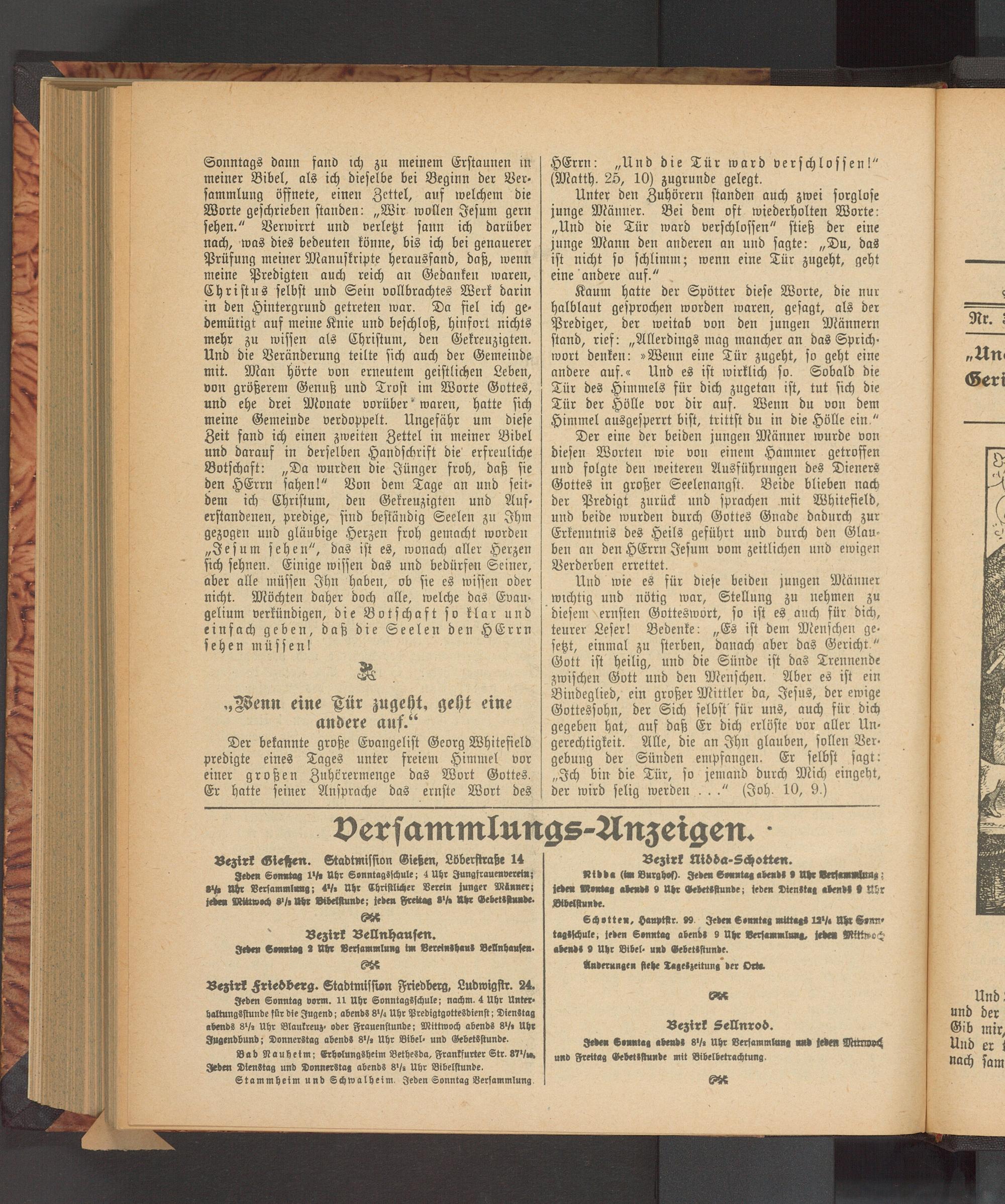 Bezirk Sellnrod. Jeden Sonntag abends 8½ Uhr Versammlung und jeden Mitrwock und Freitag Gebetsstunde mit Bibelbetrachtung.
