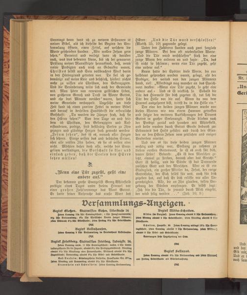 Bezirk Gießen. Stadtmission Gießen, Löberstraße 14 Jeden Sonntag 1½ Uhr Sonntagsschule; 4 Uhr Jungfrauenverein; 8% Uhr Versammlung; 4½ Uhr Christlicher Verein junger Männer; jeden Mittwoch 8/ Uhr Bibelstunde; jeden Freitag 3½ Ahr Gebets funde. N