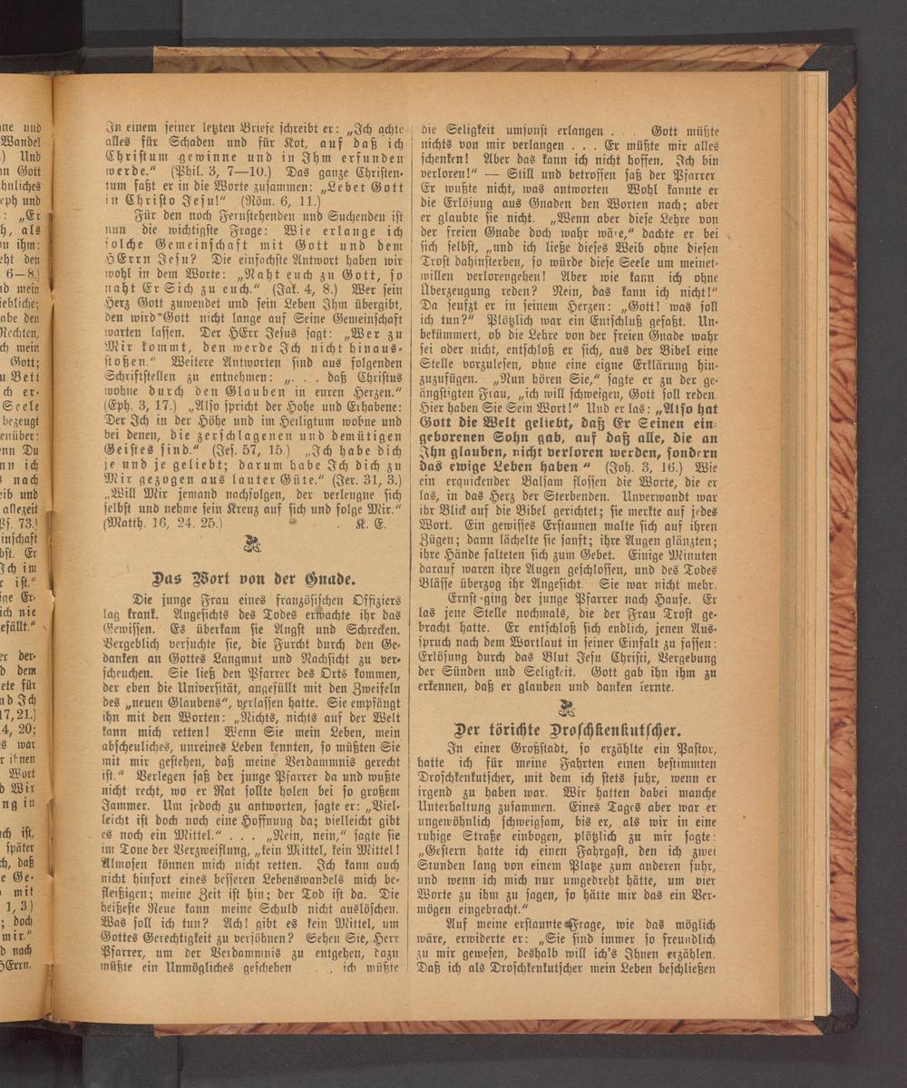 In einer Großstadt, so erzählte ein Pastor, hatte ich für meine Fahrten einen bestimmten Droschkenkutscher, mit dem ich stets fuhr, wenn er irgend zu haben war. Wir hatten dabei manche Unterhaltung zusammen. Eines Tages aber war er ungewöhnlich schweigsam, bis er, als wir in eine ruhige Straße einbogen, plötzlich zu mir sagte: „Gestern hatte ich einen Fahrgast, den ich zwei Stunden lang von einem Platze zum anderen fuhr, und wenn ich mich nur umgedreht hätte, um vier Worte zu ihm zu sagen, so hätte mir das ein Ver⸗ mögen eingebracht.“