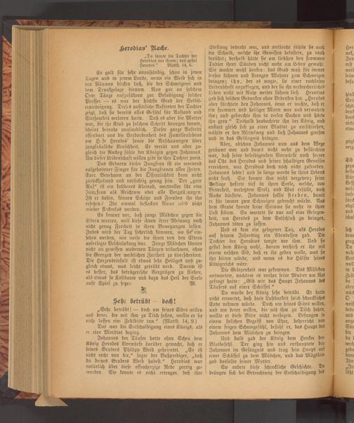 Stellung bedroht war, und vielleicht fühlte sie auch die Schuld, welche ihr Gewissen belastete, zu rauh berührt; deshalb hätte sie am liebsten den frommen Tadler ihrer Sünden nicht mehr am Leben gewußt, Sie mochte wohl denken: das Grab muß für immer diesen kühnen und strengen Mahner zum Schweigen bringen; ihn, der es wagte, sie einer ruchlosen Leidenschaft anzuklagen, und der sie ihr verbrecherisches Leben nicht mit Ruhe weiter führen ließ. Herodias gab sich solchen Gedanken ohne Bedenken hin.„Herodes aber fürchtete den Johannes, denn er wußte, daß er ein frommer und heiliger Mann war und verwahrte ihn; und gehorchte ihm in vielen Sachen und hörte ihn gern.“ Deshalb beobachtete ihn der König, und anstatt gleich sich zu einer Bluttat zu entschließen, wählte er den Mittelweg und ließ Johannes greifen und in das Gefängnis bringen.