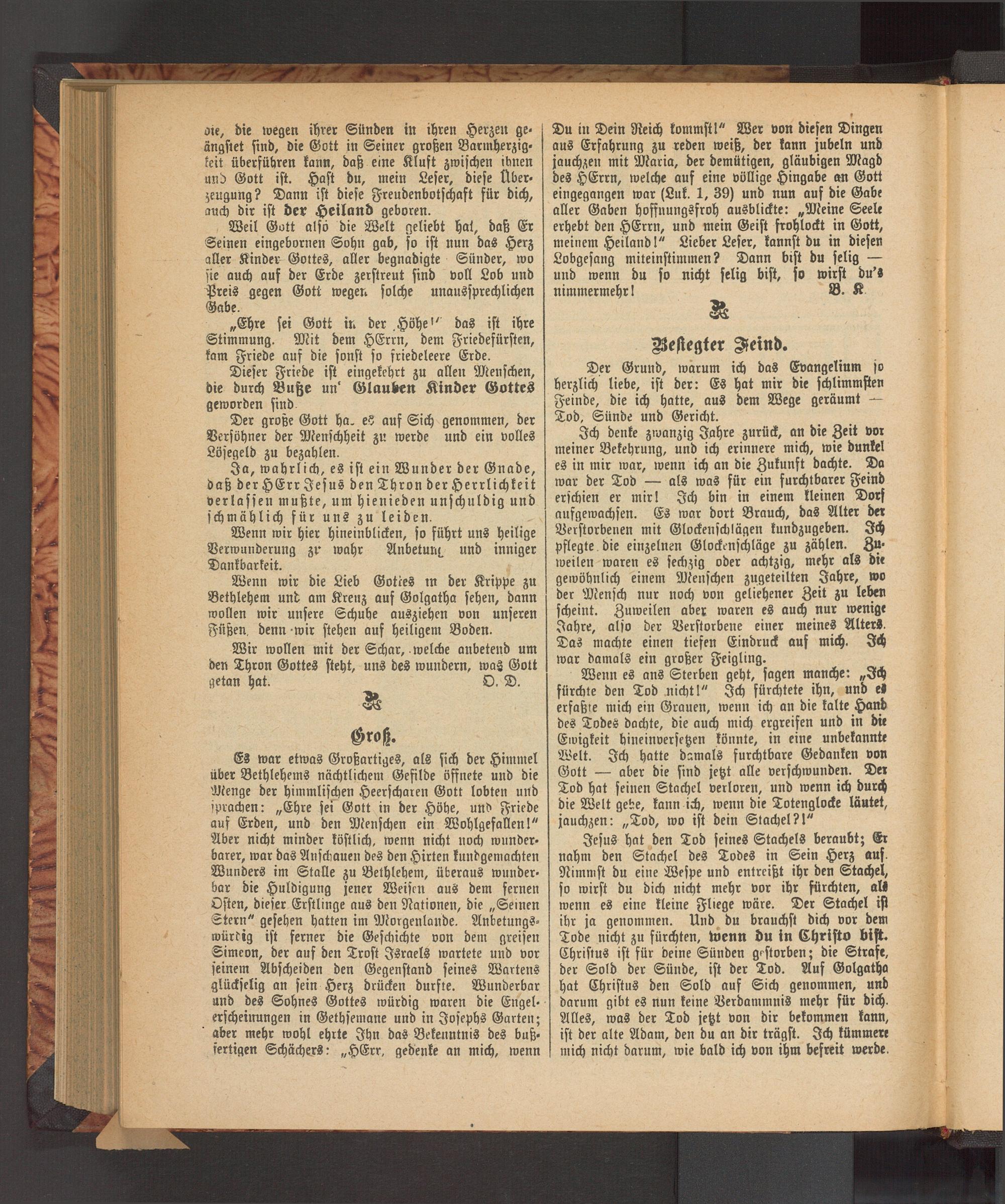 Ich denke zwanzig Jahre zurück, an die Zeit vor meiner Bekehrung, und ich erinnere mich, wie dunkel es in mir war, wenn ich an die Zukunft dachte. Da war der Tod— als was für ein furchtbarer Feind erschien er mir! Ich bin in einem kleinen Dorf aufgewachsen. Es war dort Brauch, das Alter der Verstorbenen mit Glockenschlägen kundzugeben. Ich pflegte die einzelnen Glockenschläge zu zählen. Zu⸗ weilen waren es sechzig oder achtzig, mehr als die gewöhnlich einem Menschen zugeteilten Jahre, wo der Mensch nur noch von geliehener Zeit zu leben scheint. Zuweilen aber waren es auch nur wenige Jahre, also der Verstorbene einer meines Alters. Das machte einen tiefen Eindruck auf mich. Ich war damals ein großer Feigling.