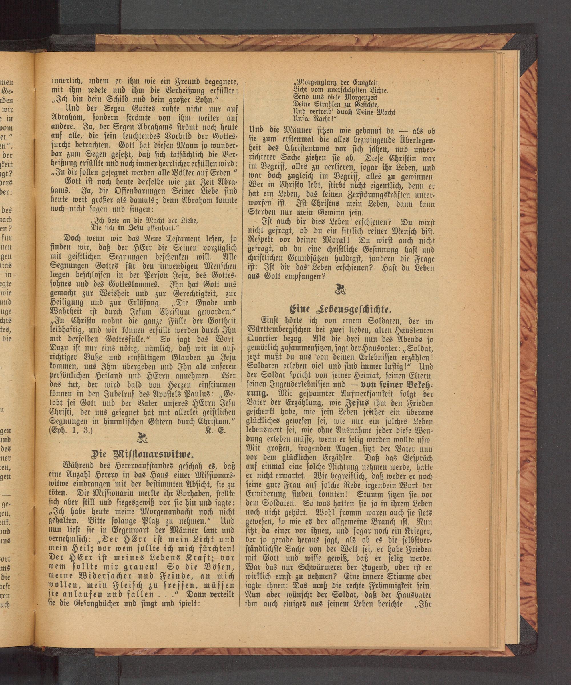 Während des Hereroaufstandes geschah es, daß eine Anzahl Herero in das Haus einer Missionars⸗ witwe eindrangen mit der bestimmten Absicht, sie zu töten. Die Missionarin merkte ihr Vorhaben, stellte sich aber still und siegesgewiß vor sie hin und sagte: „Ich habe heute meine Morgenandacht noch nicht gehalten. Bitte solange Platz zu nehmen.“ Und nun liest sie in Gegenwart der Männer laut und vernehmlich:„Der HErr ist mein Licht und mein Heilz vor wem sollte ich mich fürchten! Der HErr ist meines Lebens Kraft; vor wem sollte mir grauen! So die Bösen, meine Widersacher und Feinde, an mich wollen, mein Fleisch zu fressen, müssen sie anlaufen und fallen...“ Dann verteilt sie die Gesangbücher und singt und spielt: