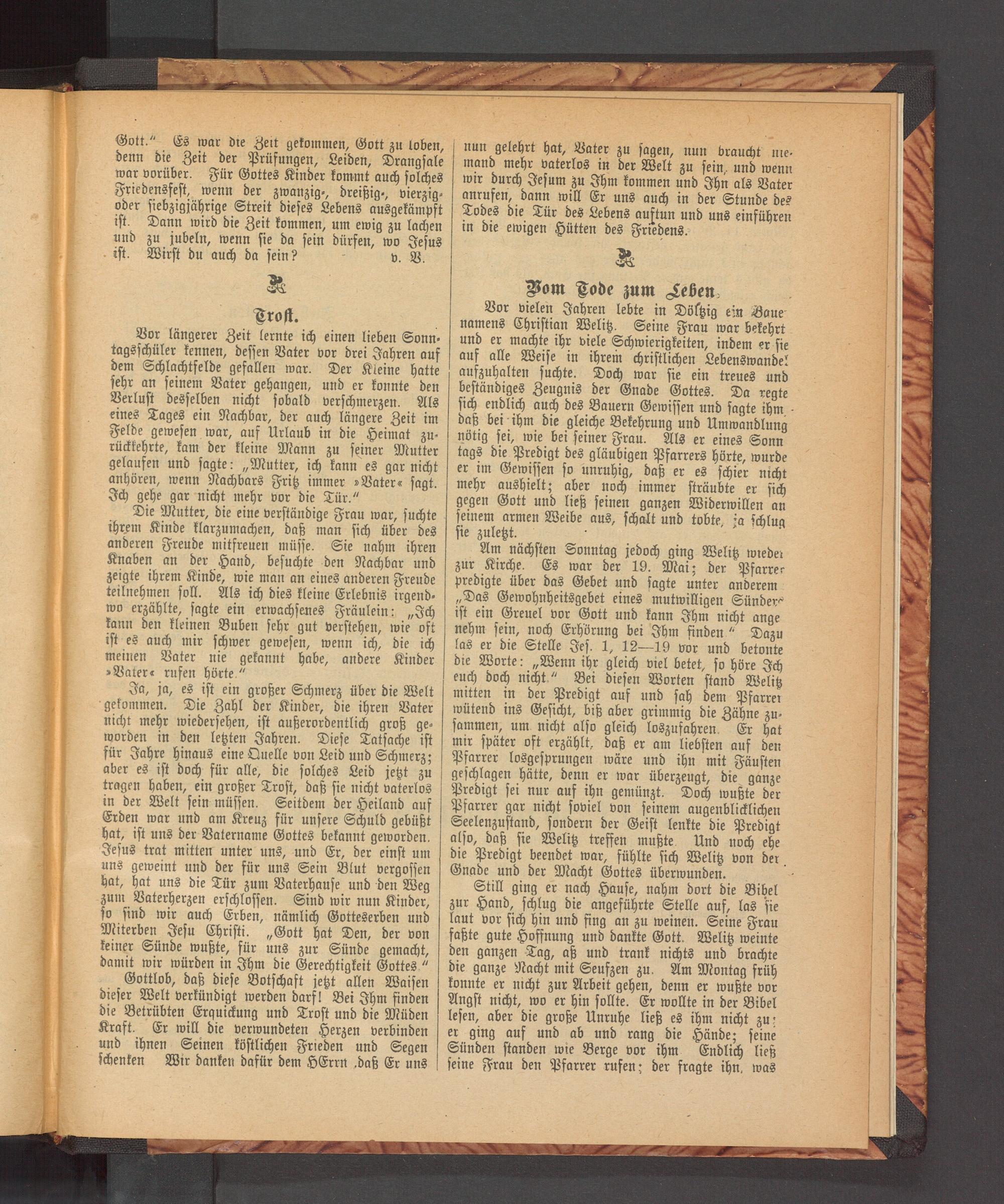 Vor vielen Jahren lebte in Döltzig ein Baue namens Christian Welitz. Seine Frau war bekehrt und er machte ihr viele Schwierigkeiten, indem er sie auf alle Weise in ihrem christlichen Lebenswandel aufzuhalten suchte. Doch war sie ein treues und beständiges Zeugnis der Gnade Gottes. Da regte sich endlich auch des Bauern Gewissen und sagte ihm daß bei ihm die gleiche Bekehrung und Umwandlung nötig sei, wie bei seiner Frau. Als er eines Sonn tags die Predigt des gläubigen Pfarrers hörte, wurde er im Gewissen so unruhig, daß er es schier nicht mehr aushielt; aber noch immer sträubte er sich gegen Gott und ließ seinen ganzen Widerwillen an seinem armen Weibe aus, schalt und tobte, za schlug sie zuletzt. 5