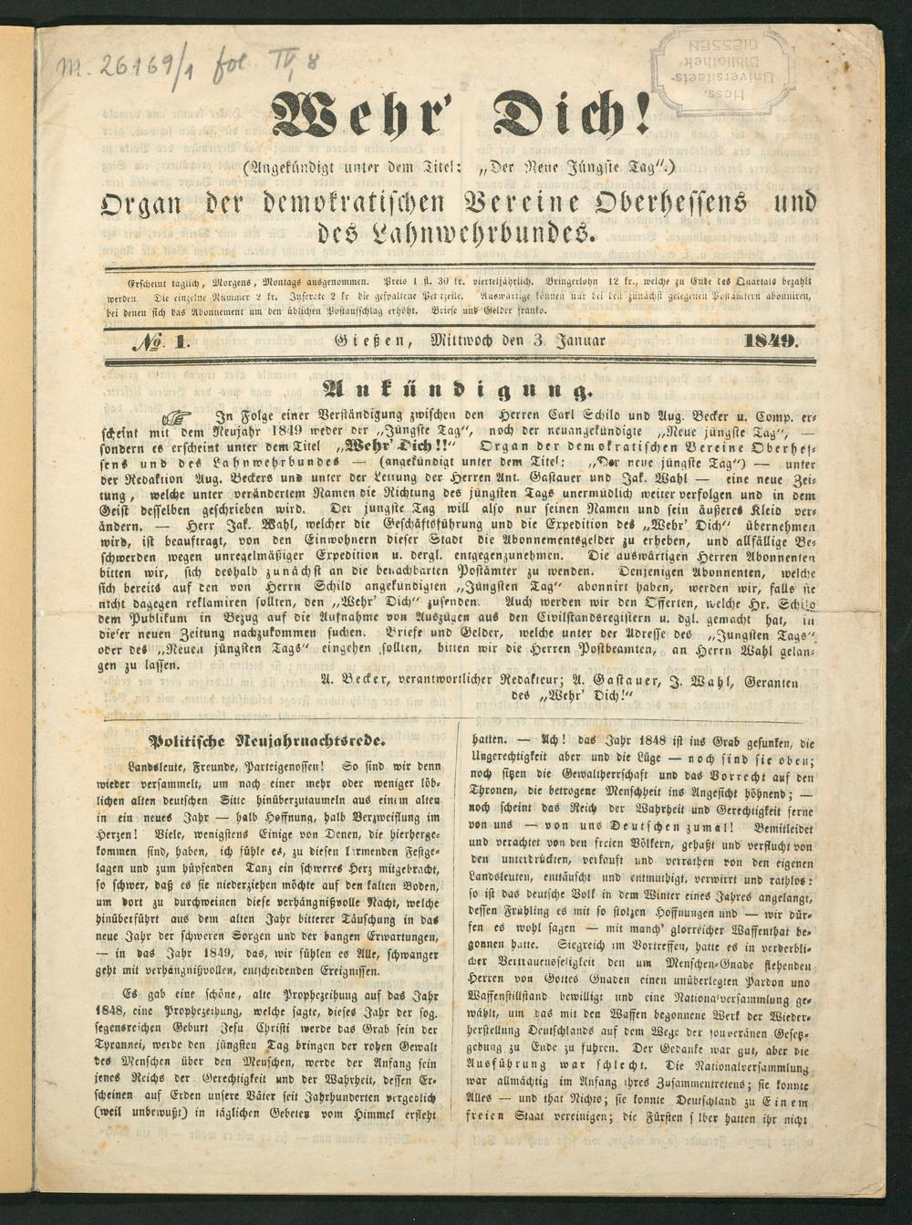 In Folge einer Verständigung zwischen den Herren Carl Schild und Aug. Becker u. Comp. er⸗ scheint mit dem Neujahr 1849 weder der„Jungste Tag“, noch der neuangekundigte„Neue jüngste Tag“,— sondern es erscheint unter dem Titel„Wehr Dieh!!“ Organ der demokratischen Vereine Oberhes⸗ sens und des Lahnwehrbundes—(angekündigt unter dem Titel:„Der neue jüngste Tag“)— unter der Redaktion Aug. Beckers und unter der Letrung der Herren Ant. Gastauer und Jak. Wahl— eine neue Zei⸗ tung, welche unter verändertem Namen die Richtung des jüngsten Tags unermüdlich weiter verfolgen und in dem Geist desselben geschrieben wird. Der jungste Tag will also nur seinen Namen und sein äußeres Kleid ver⸗ ändern.— Herr Jak. Wahl, welcher die Geschäftsfüͤhrung und die Expedition des„Wehr' Dich“ übernehmen wird, ist beauftragt, von den Einwohnern dieser Stadt die Abonnementsgelder zu erheben, und allfällige Be⸗