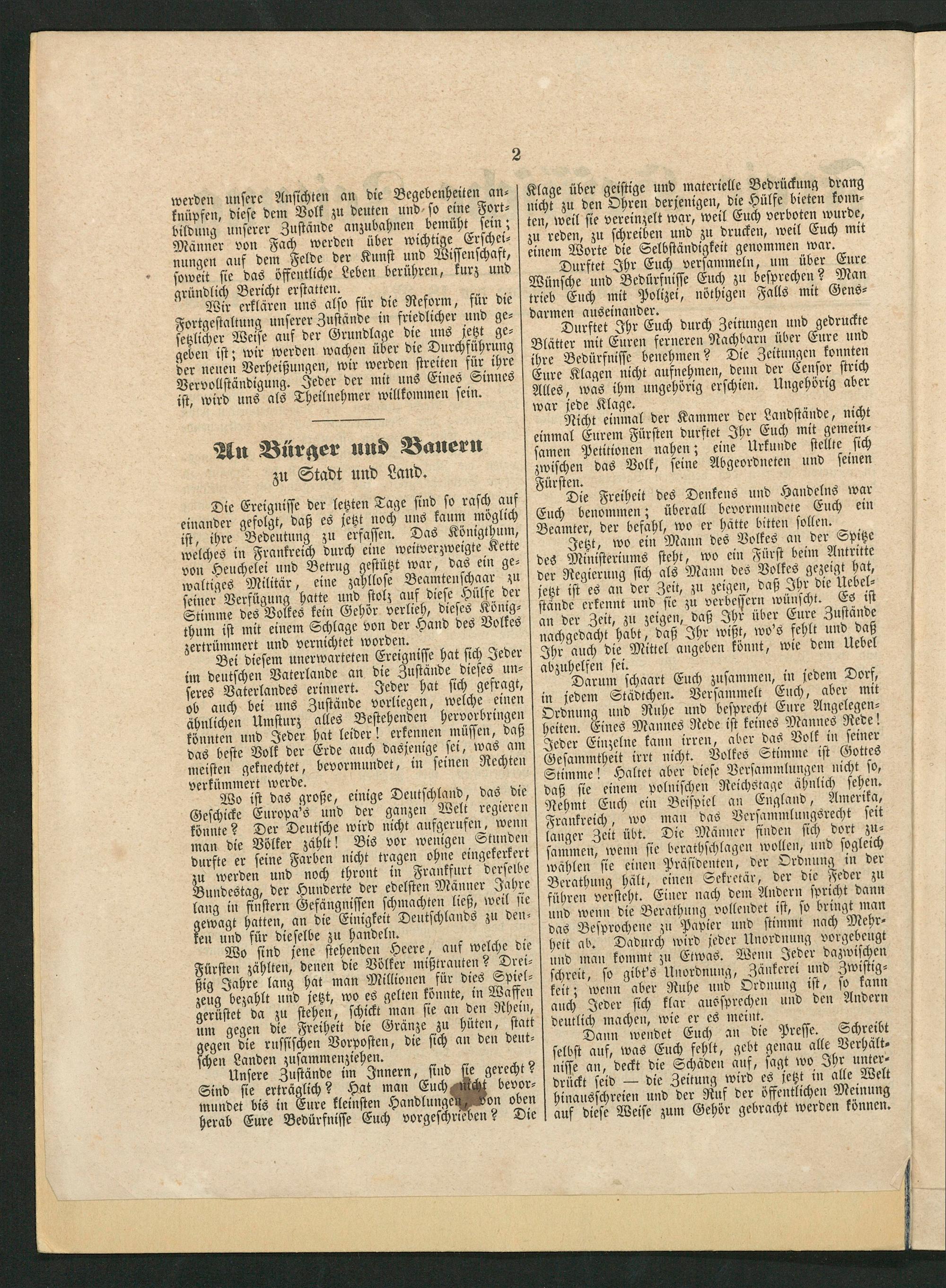 Durftet Ihr Euch durch Zeitungen und gedruckte Blätter mit Euren ferneren Nachbarn über Eure und ihre Bedürfnisse benehmen? Die Zeitungen konnten Eure Klagen nicht aufnehmen, denn der Censor strich Alles, was ihm ungehörig erschien. Ungehörig aber war jede Klage.