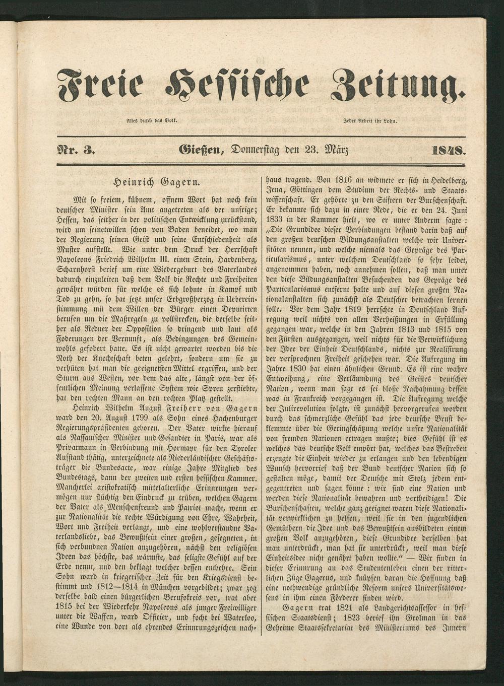 Heinrich Wilhelm August Freiherr von Gagern ward den 20. August 1799 als Sohn eines Hachenburger Regierungspräsidenten geboren. Der Vater wirkte hierauf als Nassauischer Minister und Gesandter in Paris, war als Privatmann in Verbindung mit Hormayr für den Tyroler Aufstand thätig, unterzeichnete als Niederländischer Geschäfts— träger die Bundesacte, war einige Jahre Mitglied des Bundestags, dann der zweiten und ersten hessischen Kammer. Mancherlei aristokratisch mittelalterliche Erinnrungen ver— mögen nur flüchtig den Eindruck zu trüben, welchen Gagern der Vater als Menschenfreund und Patriot macht, wenn er zur Nationalität die rechte Würdigung von Ehre, Wahrheit, Wort und Freiheit verlangt, und eine wohlverstandne Va⸗ terlandsliebe, das Bewußtsein einer großen, gesegneten, in sich verbundnen Nation anzugehören, nächst den religiösen Ideen das höchste, das wärmste, das seligste Gefühl auf der Erde nennt, und den beklagt welcher dessen entbehre. Sein Sohn ward in kriegerischer Zeit für den Kriegsdienst be— stimmt und 1812—1814 in München vorgebildet; zwar zog derselbe bald einen bürgerlichen Berufskreis vor, trat aber 1815 bei der Wiederkehr Napoleons als junger Freiwilliger unter die Waffen, ward Officier, und focht bei Waterloo, eine Wunde von dort als ehrendes Erinnrungszeichen nach—