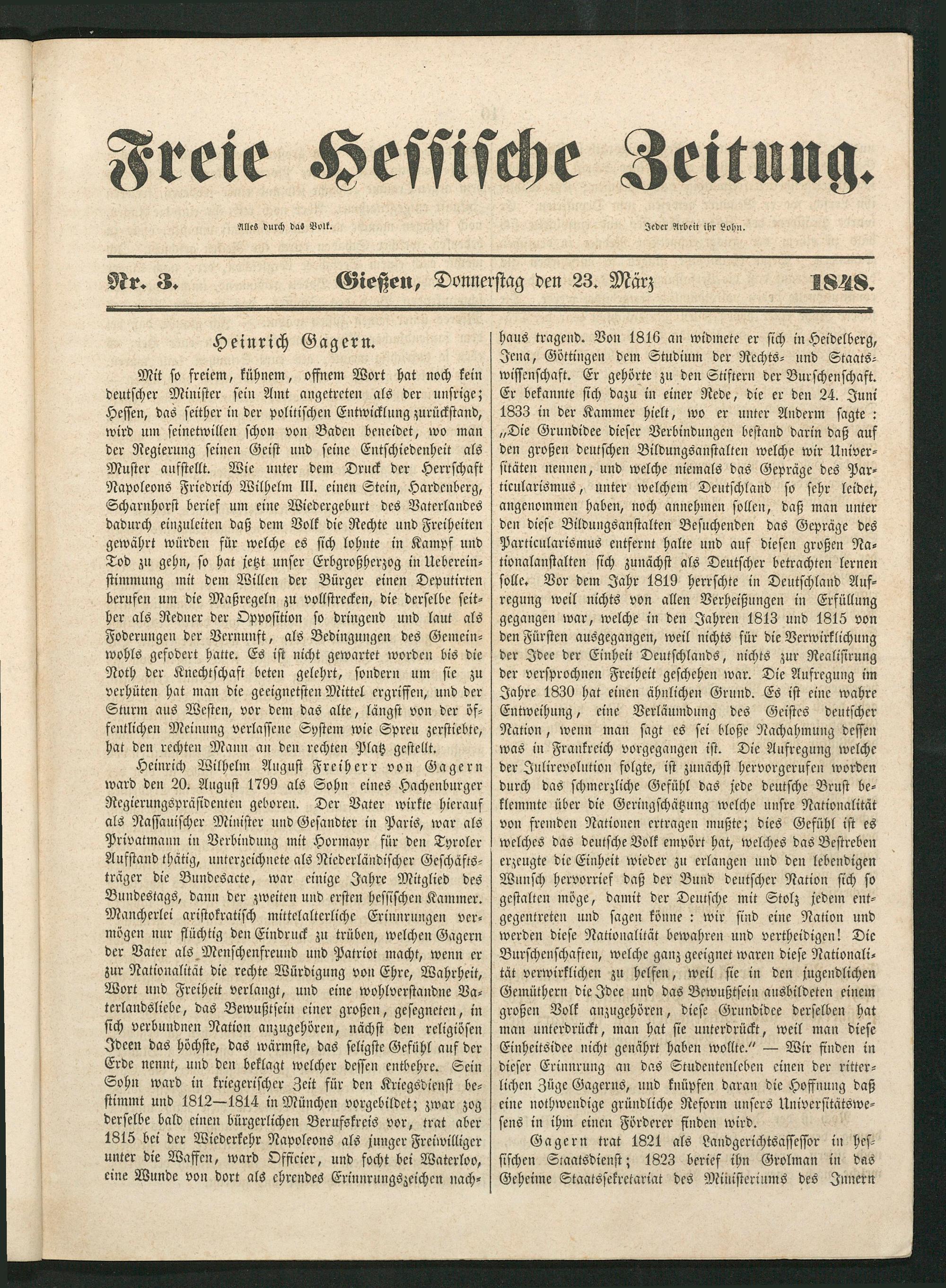 haus tragend. Von 1816 an widmete er sich in Heidelberg, Jena, Göttingen dem Studium der Rechts- und Staats⸗ wissenschaft. Er gehörte zu den Stiftern der Burschenschaft. Er bekannte sich dazu in einer Rede, die er den 24. Juni 1833 in der Kammer hielt, wo er unter Anderm sagte: „Die Grundidee dieser Verbindungen bestand darin daß auf den großen deutschen Bildungsanstalten welche wir Univer⸗ sitäten nennen, und welche niemals das Gepräge des Par⸗ ticularismus, unter welchem Deutschland so sehr leidet, angenommen haben, noch annehmen sollen, daß man unter den diese Bildungsanstalten Besuchenden das Gepräge des Particularismus entfernt halte und auf diesen großen Na— tionalanstalten sich zunächst als Deutscher betrachten lernen solle. Vor dem Jahr 1819 herrschte in Deutschland Auf— regung weil nichts von allen Verheißungen in Erfüllung gegangen war, welche in den Jahren 1813 und 1815 von den Fürsten ausgegangen, weil nichts für die Verwirklichung der Idee der Einheit Deutschlands, nichts zur Realisirung der versprochnen Freiheit geschehen war. Die Aufregung im Jahre 1830 hat einen ähnlichen Grund. Es ist eine wahre Entweihung, eine Verläumdung des Geistes deutscher Nation, wenn man sagt es sei bloße Nachahmung dessen was in Frankreich vorgegangen ist. Die Aufregung welche der Julirevolution folgte, ist zunächst hervorgerufen worden durch das schmerzliche Gefühl das jede deutsche Brust be⸗ klemmte über die Geringschätzung welche unsre Nationalität von fremden Nationen ertragen mußte; dies Gefühl ist es welches das deutsche Volk empört hat, welches das Bestreben erzeugte die Einheit wieder zu erlangen und den lebendigen Wunsch hervorrief daß der Bund deutscher Nation sich so gestalten möge, damit der Deutsche mit Stolz jedem ent— gegentreten und sagen könne: wir sind eine Nation und werden diese Nationalität bewahren und vertheidigen! Die Burschenschaften, welche ganz geeignet waren diese Nationali⸗ tät verwirklichen zu helfen, weil sie in den jugendlichen Gemüthern die Idee und das Bewußtsein ausbildeten einem großen Volk anzugehören, diese Grundidee derselben hat man unterdrückt, man hat sie unterdrückt, weil man diese Einheitsidee nicht genährt haben wollte.“— Wir finden in dieser Erinnrung an das Studentenleben einen der ritter⸗ lichen Züge Gagerns, und knüpfen daran die Hoffnung daß eine nothwendige gründliche Reform unsers Universitätswe⸗ sens in ihm einen Förderer finden wird. 5 Gagern trat 1821 als Landgerichtsassessor in hes⸗ sischen Staatsdienst; 1823 berief ihn Grolman in das Geheime Staatssekretariat des Ministeriums des Innern