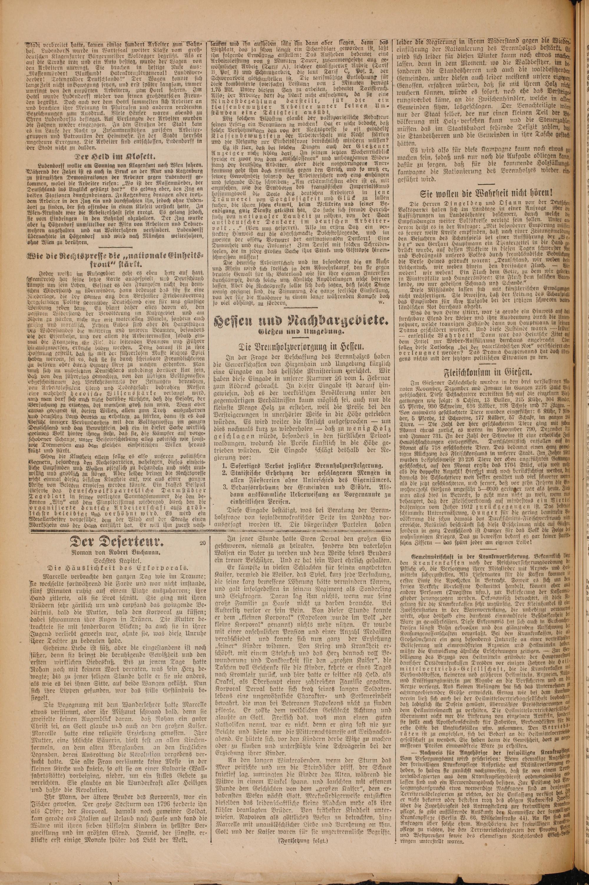 Im Gießener Schlachthofe wurden in den drei verfloff. naten November, Dezember und Januar im Gauzen 2276 S geschlachtet. Diese Schlachtttere verteilten sich auf die einzelnen i gattungen wie folgt: 8 Ochsen, 13 Bullen, 2415 Kühe, 304 Rin 45 Pferde, 930 Schweine, 616 Kälber, 108 Schafe und 37 Von auswärts geschlachtete Tiere wurden eingeführt: 6 K der, 5 Pferde, 12 Schweine, 177 Kälber, 57 Schafe, im Ticre.— Die Zahl der hier geschlachteten Tiere ging Monat etwas zurlick, es waren im November 790, Dezen und Januar 731. In der Zahl der Schweine ist eine erhe Hausschlachtungen einbegriffen. Durchschnittlich entfallen Monat al so 758 geschlachtete Tiere. Das bedeutet einen g tigen Rückgang des Fleischkonsums in unserer Stadt. Im Ja wurden beispielsweise 23 226 Tiere der oben angeführten G geschlachtet, auf den Monat ergibt das 170 Stück, also als die doppelte Anzahl! Hiergei muß noch berücksichtigt w damals die Schlachttiere weit besser genährt und viel schwerer als die jetzt geschlachteten, und ferner, daß vor zehn Johren wohnerzahl Gießens ungefähr 5— 60000 geringer war als man alles dies in Betracht, so geht man ncht zu weit, behauptet, daß der Fleischverbrauch auf mindestens ein desjenigen vom Jahre 1912 zurückgegangen ist. Das schlimmste Unterernährung, Hunger für die gering be völkerung die schon damals den Durchschnitts⸗Fleischverhre erreichte. Natürlich beschränkt sich diese Erscheinung nicht au sondern in ganz Deutschland ist Hunger für das Volk die 8 wahnsinnigen Krieges. Das zu beweisen bedarf es gar keiner schen Ziffern— das spürt jeder am eigenen Leibe!