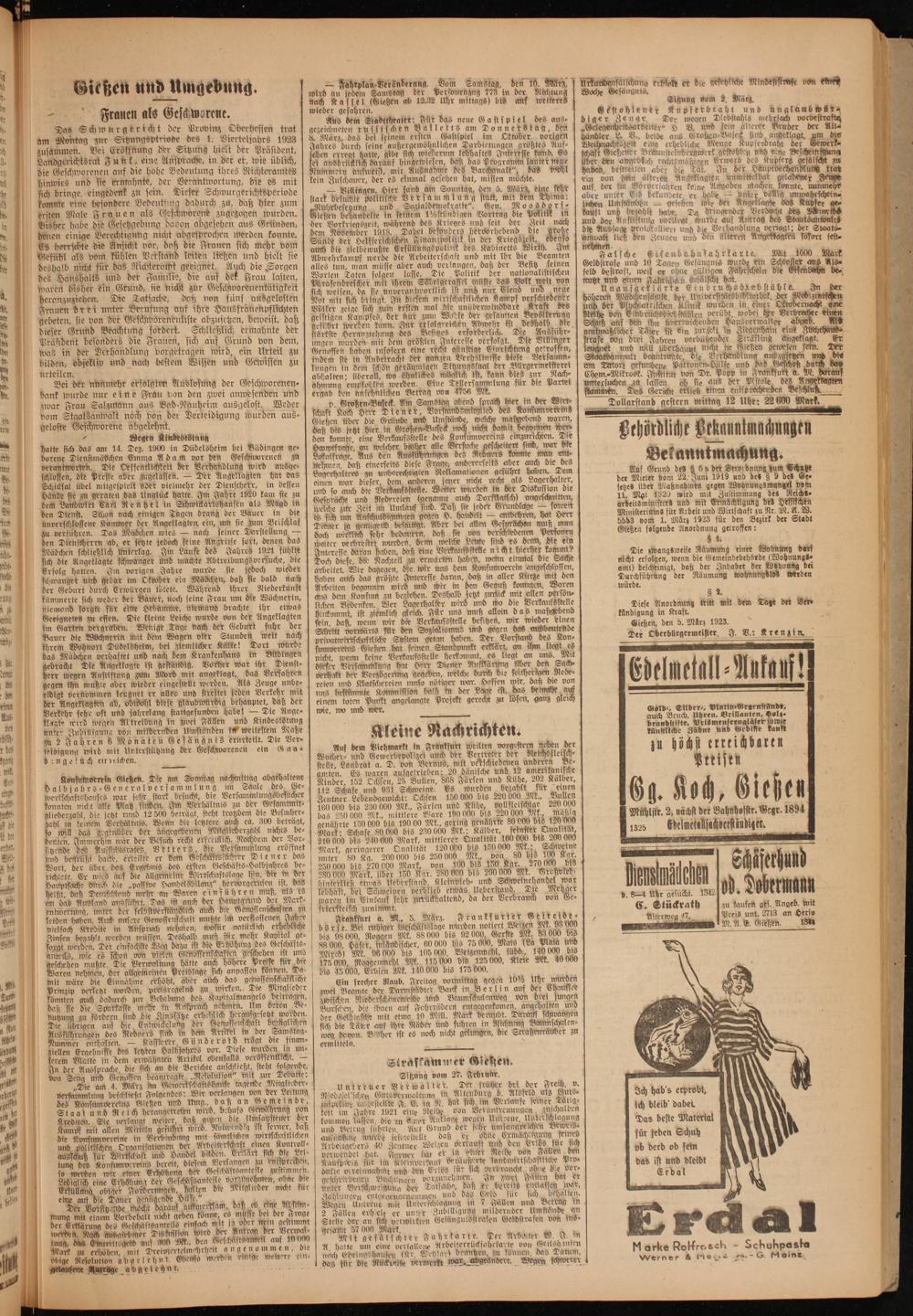 Diese Anordnung tritt mit dem Tae dir Ver⸗ kündigung in Kraft. Gießen, den 5. März 1923. Der Oberbürgermeister. J. V.: Krenzin