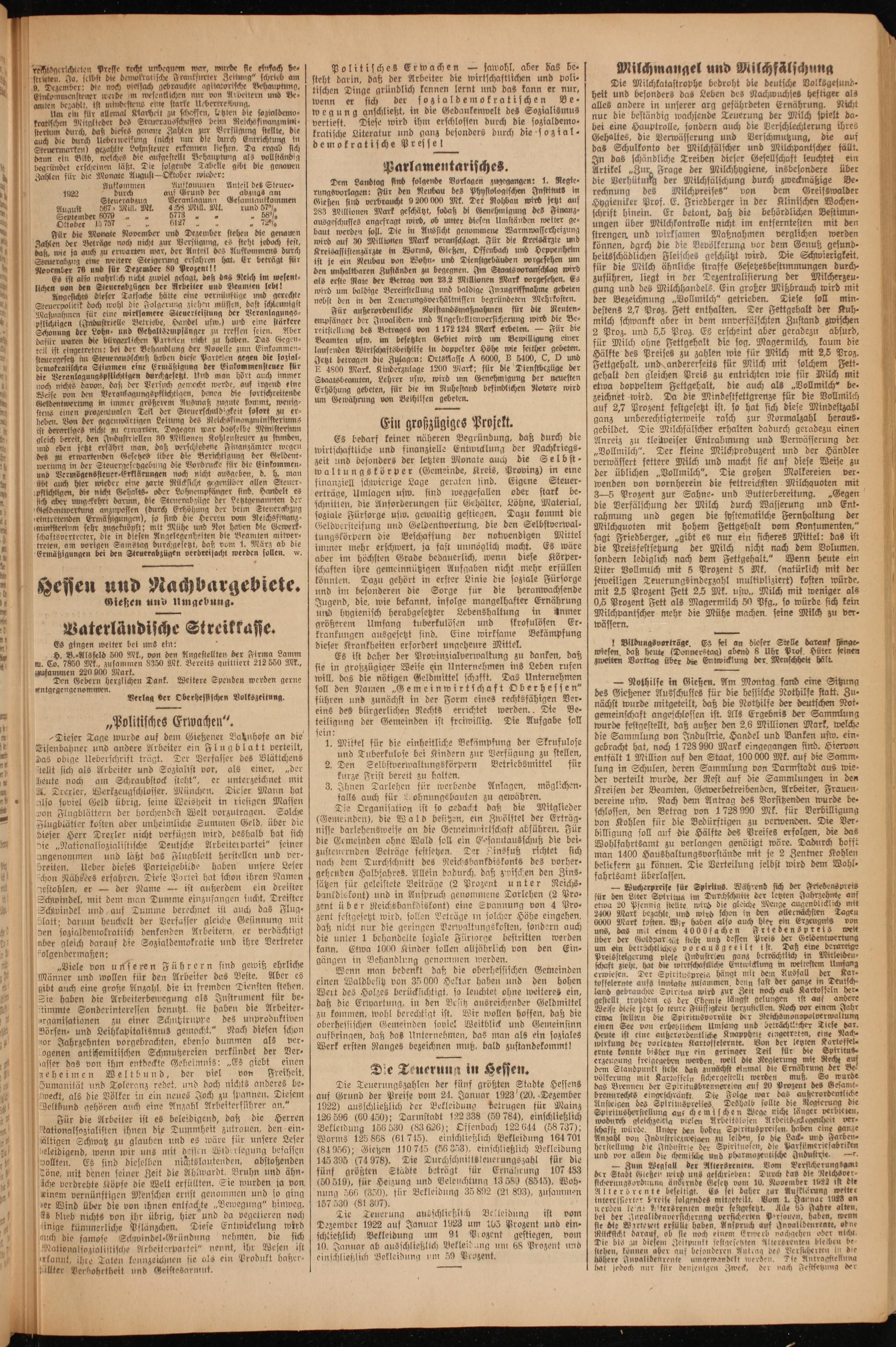 10 Viele von unseren Führern sind gewiß ehrliche 1 5 1 N 0 2 1 0 f„Resszi f schaft zieht, hat die wirtschaftliche Entwicklung in weitestem Umfang 1 Männer und wollen für den Arbeiter das Beste. Aber es e W 100 e Gemeinden erwiesen. Der Spirituspreis hängt mit den Ausfall der Kar⸗ 00 gibt auch eine große Anzahl, die in fremden Diensten stehen. uten Nalebe it von 35000 Hektar haben und den hohen sosselernte aufs sunkaßte zusammen, deun fat der gauze in Deuisch⸗ 15 N. l 1 ö Wert des Holzes berücksichtigt, so leuchtet ohne weiteres ein, land gebrauchte Spiritus wird zur Zeit noch aus Kartoffeln her⸗ 0 Sie haben die Arbeiterbewegung als Instrument für be⸗ e 0 N a e af rd 15 lande gelungen i i 2 1 8 4 je Arbeiter. daß die Erwartung, in den Besitz ausreichender Geldmittel gestellt troßdem es der Chemse längst gelungen it auf andere 10 timmte Sonderinteressen benutzt. sie haben die Arbeite zu kommen, wohl berechtigt ist. Wir wollen hoffen, daß die Weise diese jetzt so teure Fllissigkeit herzustellen. Noch vor einem Jahr 7 organisationen zu einer Schutztruppe des unproduktiven bee Gemein 1 soviel Weitbli 1 etwa stellten die Spiritusvorräte der Reichsmonopolverwaltung * Börsen und Leihkapitalismus gemocht.“ Nach diesen schon 0 erhessischen Gemeinden soviel Weitblick und Gemeinsinn einen See von erheblichem Umsang und beträchtlicher Tiefe dax. 5 or Jahrzehnten vorgebrachten, ebenso dummen als ver⸗ aufbringen, daß das Unternehmen, das man als ein soziales Heute ist eine außerordentliche Knappheit eingetreten, eine Nach- ö 19 sgogenen antisemitischen Schmutzereien verkündet der Ver⸗ Werk ersten Ranges bezeichnen muß, bald zustandekommt! a Se N Tel„ür de 8 1 7 0 1 1 2 isher in ge 5 aasser das von ihm entdeckte Geheimnis:„Es giebt einen. 1 erzeugung freigegeben werben. weil die Regterung mit Recht auf 1 geheimen Weltbund, der viel von Freiheit, Die Teuerung in Hessen. 115 Standpunkt stcht daß zunächst einmal die Ernährung der— „ ementttt van Teles redet dun doc nials dnderes be. ie Telermng zahlen der uf grötten Siedte geen des Pre n der Spleens en Jö pee e e wweckt, als die Völker in ein neues Joch zu spannen. Diesem auf Grund der Preise vom 21. Januar 1923/(20. Dezember brennrechts eingeschränkt. Die Folge war das außerordentliche 40 Jeltbund gehören auch eine Anzahl Arbeiterführer an.“ 1922) ausschließlich der Bekleidung betrugen für Mainz] Ansteigen des Spfrituspreises Deshalb sollte die Regierung die 15 Zür die Arbeiter ist es beleidigend, daß die Herren 126 596(60 450); Darmstadt 132 338(59 784), einschließlich] Spurktusherstellung auf chemilchen Wege nicht länger verbieten, 11 1 ee a 1 8 14 20 55. 5 1 0 590 wodurch gleichzeikia vielen Arbeitslosen Arbeitsgkegenheit ver⸗ 11 dationalsozialisten ihnen die Dummheit zutrauen, den ein- Bekleidung 156 530(83 626); Offenbach 122 644(58 737); schafft würde. Unter den hoben Spirtuspreisen haben eine ganze aältigen Schwatz zu glauben und es wäre für unsere Leser Worms 125 868(61 745), einschließlich Bekleidung 164701] Anzahl von Industrsezweigen zu leiden so die Lack- und Farben- 40 eleidigend, wenn wir uns mit desson Widerlegung befassen(84956); Gießen 110745(56 953), einschließlich Bekleidung herstellung die Industrie der Spirituosen, die Parfümeriefabriken 1 Bollten. Es sind dieselben nichtslautenden, abstoßenden 145 395(74978). Die Turchschnittsteuerungszahl für die und vor allem die chemische und pharmazeutische Industrie.. + Töne, mit denen seiner Zeit die Ahlwardt, Bruhn und ähn- fünf größten Städte beträgt für Ernahrung 107 483 F eee e 15 5 sche verdrehte Köpfe die Welt erfüllten. Sie wurden ja von.(50519), für Heizung und Beleuchtung 13 580(8545), Woh- sicherungsorbnung ändernde Gese dem 10 Noemdes iu 1 einem vernünftigen Menschen ernst genommen und so ging nung 566(350), für Bekleidung 35892(21893), zusammen[Altersrente beseitigt. Es sei daher zur Aufklärung weiter 2 9 5. 5 N ö ber Wind über die von ihnen entfachte„Bewegung“ hinweg. 157 530(81 807). N. ehe folgendes 9 Vom 1. Har nat 1028 an „4s blieb nichts von ihr übrig, hier und da vegetieren noch Tie Teuerung ausschließlich Bekleidung ist vom bel der 0 wwallb 1 mehr kesdgesent. Ade 5 Nhe Aten. * ini 1 4 771 3 1% cd 770 0 5 923„ N r In enversicherung verficherten Personen, haben, wenn 5 inige kümmerliche Pflänzchen. Diese Entwickelung wird[Dezember 1922 auf Januar 1923 um 105 Prozent und ein. sie die Wartezelt erfüllt haben, Anspruch auf Invalldenrente, obne 14 auch die famose Schwindel⸗Gründung nehmen, die sich schließlich Vekleidung, um 91 Prozent gestiegen, vom J Mlcckstcht 1 ob sie noch einem Erwerb nachgehen oder nicht. 11 Mationalsozialistische Arbeiterpartei“ nennt, ihr Wesen ist 10. Januar ab ausschließlich Bekleidung um 68 Prozent und n* Aae Nr 19 5 U 4 7 22„* 4 ee 8 Ea 1 5 dor 9„ er eo a 9* des Ver 1 1 kannt, ihre Taten kennzeichnen sie als ein Produkt haßer-einschließlich Bekleidung um 50 Prozent. höhere Ianallbekrente ante We Mere Tie rege e a— hat jedoch nur für denjenigen Zweck, der nach Festsetzung der