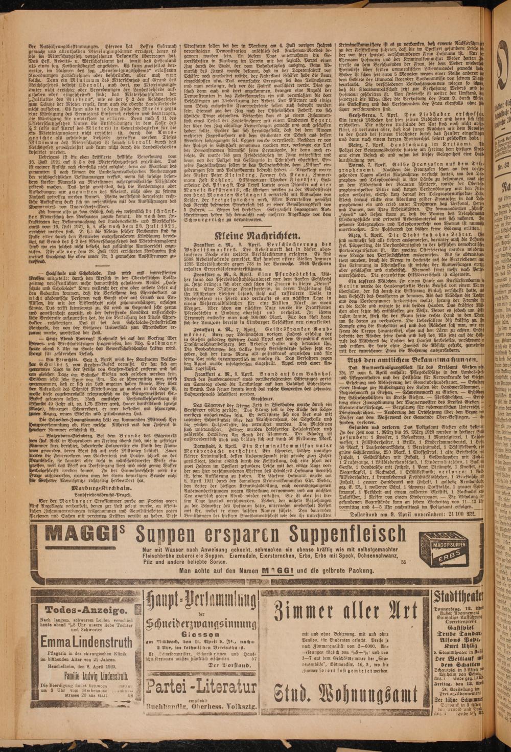 Gefunden und verloren. Das Polizeiamt Gießen gibt bekannt In der Zeit vom 1. März bis 28. März 1923 wurden in hiesiger Suh gefunden: 1 Kneifer, 1 Rosenkranz, 1 Mantelgürtel, 1 Tasches, messer, 1 Füllfederhalter, 1 Brille, 1 Kindersammetbeutel, 1 Huh, 50 Mark, 1 Tausendmarks⸗