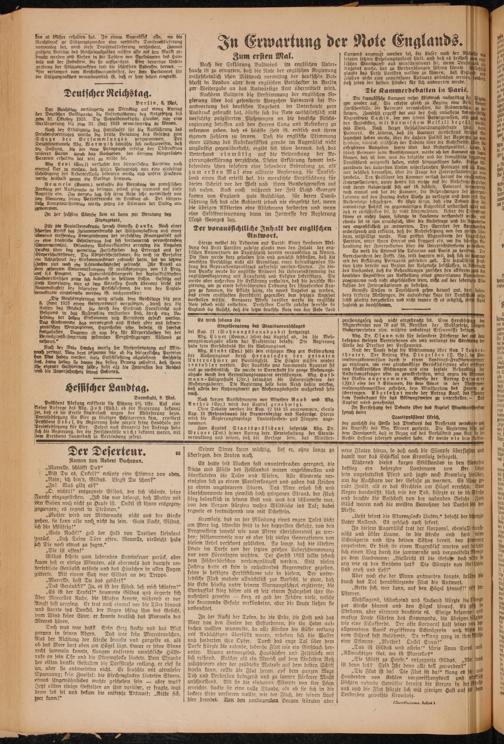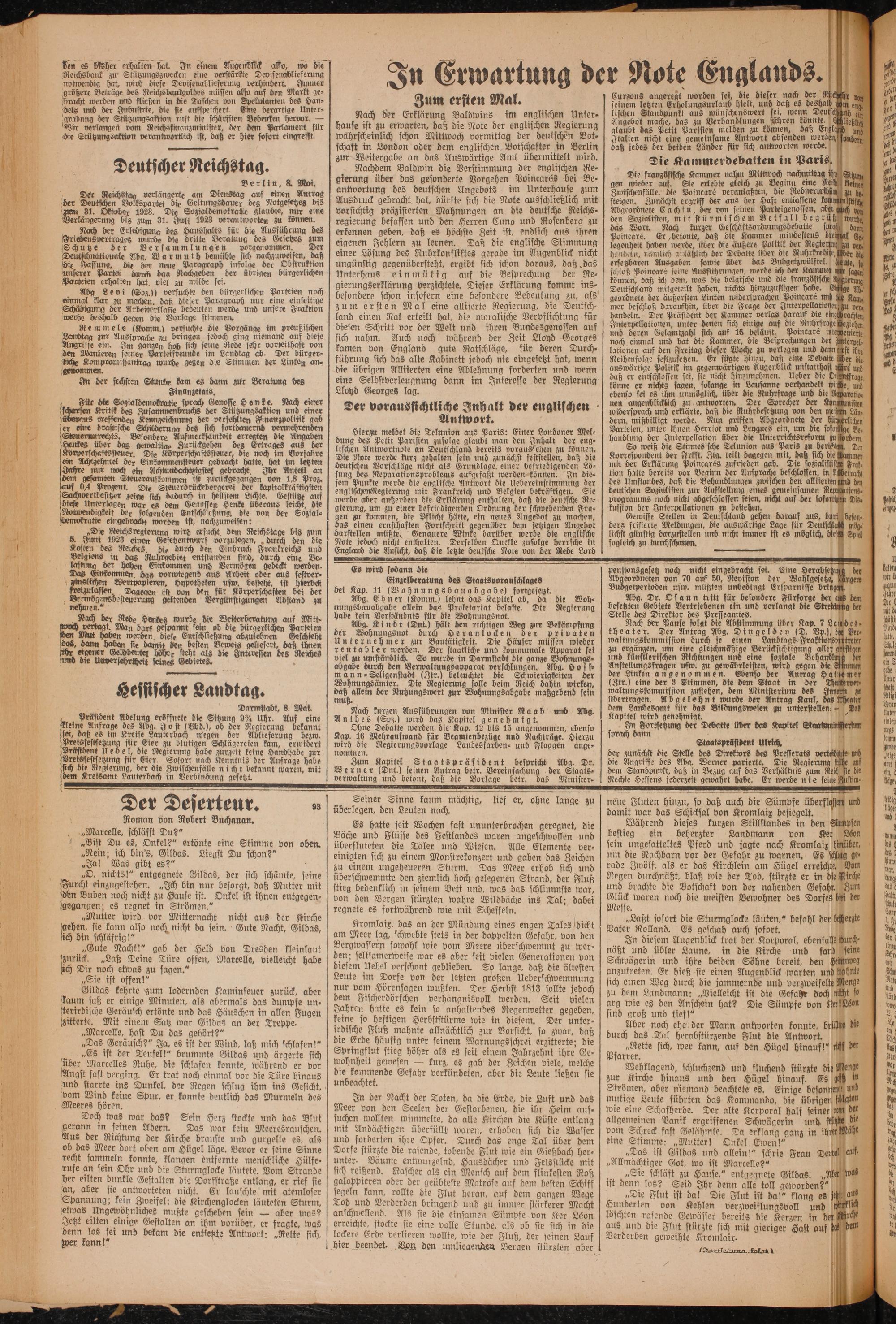 . Berlin, 8. Mai. „Der Reichstag verlängerte am Dienstag auf einen Antrag der Deutschen Volkspartei die Geltungsdauer des Notgesetzeg bis dum 31. Oktober 1923. Die Sozialdemokrathe glaubte, nur eine Verlängerung bis zum 31. Juli 1923 verantworten zu können.