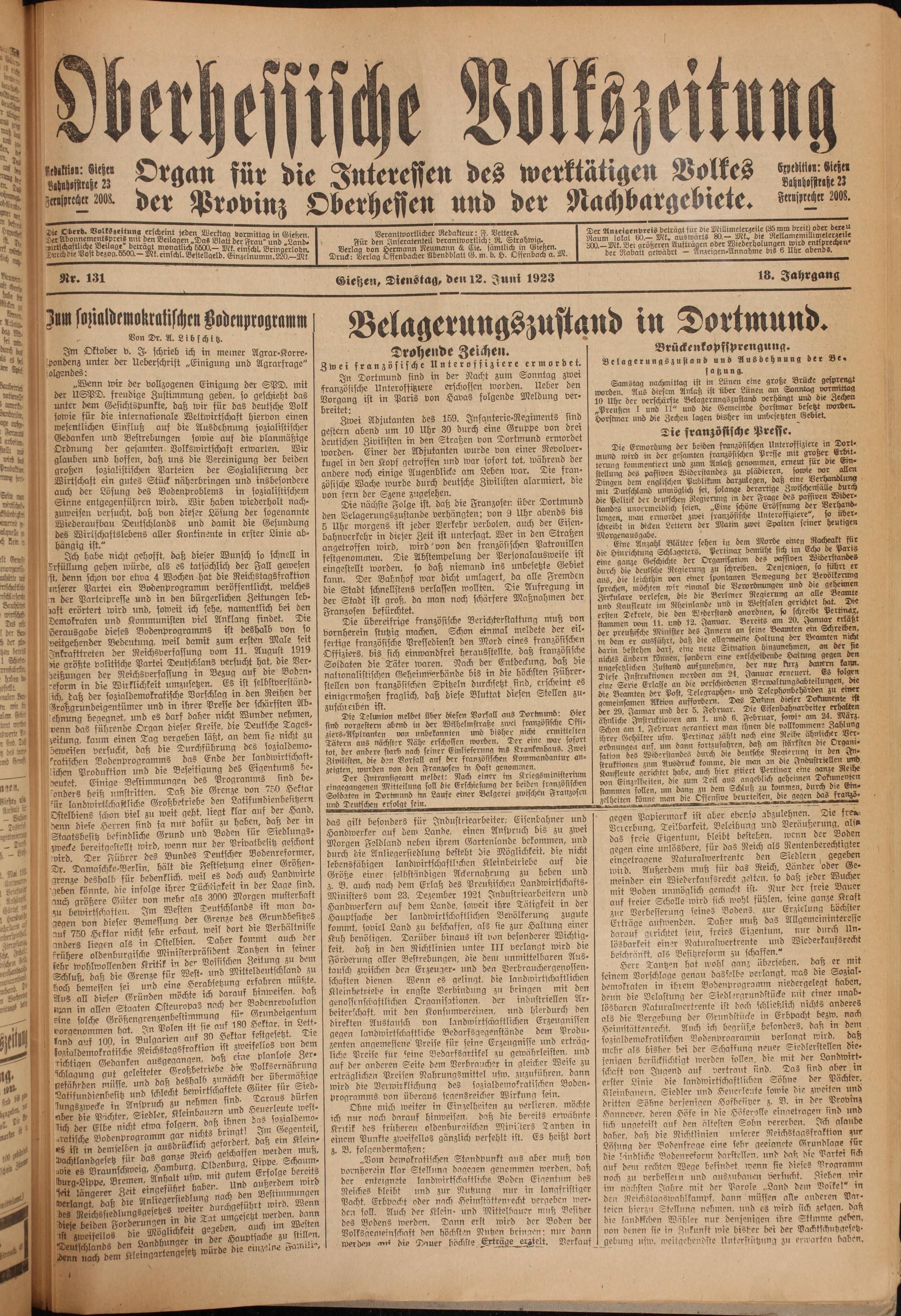 ation: Gießen O 85 24 8 242 5 n Organ für die Interessen des werktätigen Volkes Wonen arge — zernsprecher 20bb. d er 5 f a 0 Buhnhofstraße 2 1 Provinz Oberhessen und der Nachbargebiete. u en )!!! r„ * eee eee eee ee Ede heel are e e i fr D 1 a N 5 Gießen, Dienstag, den 12. Juni 1923 183. Jahrgang Jun sozialdemokrali N 5 2 rülischen Boden B. U