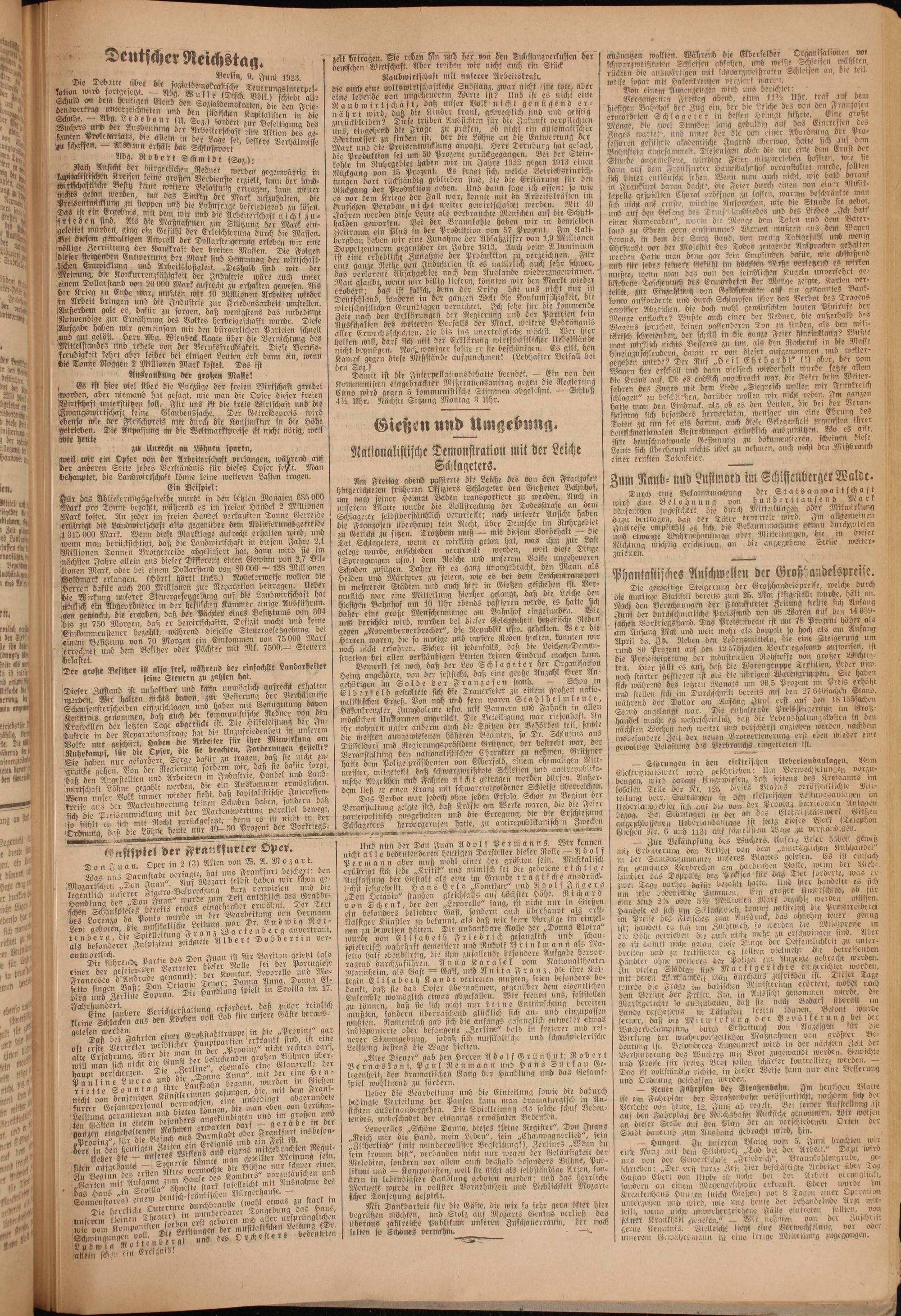 Am Freitag abend passierte die Leiche des von den Franzosen hingerichteten früheren Offiziers Schlageter den Gießener Bahnhof, um nach seiner Heimat Baden transportiert zu werden. Auch in unserem Blatte wurde die Vollstreckung der Todesstrafe an dem Schlageter selbstverständlich verurteilt; nach unserer Ansicht haben die Franzosem überhaupt kein Recht, über Deutsche im Ruhrgebiet Trotzdem muß— mit diesem Vorbehalt— die Tat Schlageters, wenn er wirklich getan hat, was ihm zur Last gelegt wurde, entschieden verurteilt werden, weil diese Dinge (Sprengungen usw.) dem Reiche und unserem Volke An Schaden zufügen. Daher ist es ganz unangebracht, den Mann als Helden und Märtyrer zu feiern, wie es bei dem Leichentrans port in mehreren Städten und auch hier in Gießen geschehen ist. Ver⸗ mutlich war eine Mitteilung hierher gelangt, daß die Leiche den hiestgen Bahnhof um 10 Uhr abends passieren werde, es hatte sich daher eine große Menschenmenge am Bahnhof eingefunden. ez uns berichtet wird, wurden bel dieser Gelegenheit hetzerische Reden gegen„Novemberverbrecher“, die Republik üsw. gehalten. Wer die Herren waren, die so mutige und tapfere Reden hielten, konnten wir noch nicht erfahren. Sicher ist jedenfalls, daß die Leichen⸗Demon⸗ stration bei allen verständigen Leuten keinen Eindruck machen kann.