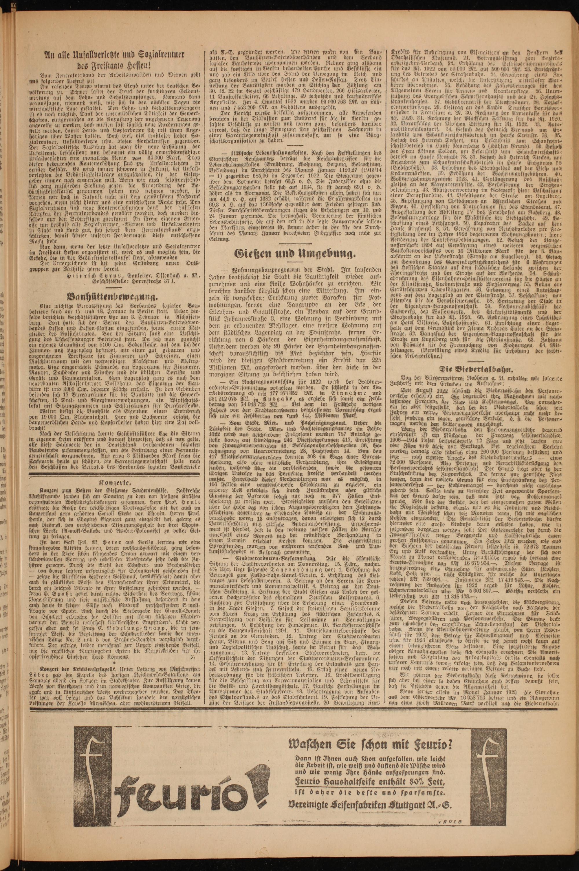 Kredkts flir Anbringung von Eisengittern an den Fenstern des Oberhessischen Museums. 21, Beitragsleistung zum Be zirks⸗ arbeitgeber⸗Verband. 22. Erhöhung des Selostveysiche rungsslocls für das Ri. 1922 ron 50% 000 Mk. auf 500 000 k. 23. Einschränk⸗ ung des Betriebes der Straßenbahn. 24. Gewährung eines Zu⸗ schusses an Anstalten, welche die Unterstützung mittelloser Wan⸗ erer übernehmen. 25. Erhöhung des Jahresbeitrages für den Allgemeinen Verein für Armen- und Krankenpflege. 25. Unter⸗ stützung des Evangelischen Schwesternhauses und des St. Josephs⸗ Krankenhauses. 27. Gebührentarif der Dienstmänner. 28. Soßiar⸗ rentnerfürsoz ge. 29. Beitrag an das Archiv Deutscher Berufsvor⸗ münder in Franlfurt a. M. 30. Rechnung der Armenlasse für das Ni. 1920. 31. Rechnung der Plockschen Stistung für das Rl. 1920. 32. Voranschlag der Ploschen Stiftung für Rj. 1922. 33. Auto⸗ mobildroschlentgrif. 34. Gesuch des Heinrich Bremond um Er⸗ laubnis zum Schankwirtschaftsbetrieb im Hause Steinstr. 76. 35. Gesuch des Heinrich Dechert, um Erlaubnis zum Schankwirt⸗ schaftsbetrieb im Hause Neuenbäue 5(Kühlen Grund). 36. Ges der Frau Minna Soldan, um Erlaubnis zum Schankwirtschafts⸗ betrieb im Hause Neustadt 78. 37. Gesuch des Heinrich Stecken, um Erlaubnis zum Schankwirtschaftsbetrieb im Hause Eichgärten 50 (Liebigshöhe). 38. Erhöhung des Standgeldes auf den Vieh⸗ und Krämermärkten. 39. Erhöhung der Wochenmarktgebühren. 40. Wohnungsbauprogramm 19023. 41. Verlängerung des Anschluß⸗ gleises an der Margaretenhütte. 42. Verbesserung der Straßen⸗ beleuchtung. 43. Abhitzeverwertung im Gaswerk; hier: Veschaffung einer Dampfturbine. 44. Befestigung der Straße am Kugelberg. 45. Anpflanzung von Obstbäumen an öffentlichen Straßen und Wegen. 46. Herstellung von Amtsräumen sür das Standesamt. 47. Ausgestaltung der Abteilung I/ des, Friedhofes am Rodtberg. 48. Beleuchtungsanlage für die Waschküche der Liebigshöhe. 49. Ve⸗ schaffung eines Leihsarges. 50, Reparatur des Daches auf denn Hause Kirchenpl. 8. 51. Gewährung von Reichsdarlehen zur Fec⸗ tigstellung der im Jahre 1922 begonnenen Wohnungsbauten; hier: Aenderung der Tarlehensbedingungen. 52. Gesuch der Vauge⸗ nossenschaft 1894 auf Gewährung eines weiteren verzinslichen Baukostenvorschusses von 10 Millionen Mark für den 3. Bau⸗ abschnitt an der Licherstraße(Straße am Kugelberg). 53. Gesuch um Gewährung des Gemeindepflichtdarlehens für 6 Wohnungen des Hessischen Staates auf dem städtischen Gelände Jheringsstraße und der Straße auf der Weißerde. 34. Schluß⸗ abrechnung des Eisenbahner⸗Heimstättenvexeins für die Häuser an der Klinikstraße, Crednerstraße und Wetzlarerweg. 55. Anbau anr Geräteschuppen Oswaldsgarten. 36. Erbauung eines Autoschup⸗ pens auf dem Lagerplatz an der Steinstraße. 57. Beschaffung von Litewken für die Berufsfeuerwehr. 58. Vertretung der Stadt in der Eigenheim⸗Baugenossenschaft. 59. Rechnungsabschlüsse des Gaswerks, des Wasserwerks, des Elektrizitätswerks d der Straßenbahn für das Ri. 1920. 60. Anbringung eines Lichtbildes am Hotel Viktoria, Bahnhofstraße. 61. Errichtung einer Lager⸗ 5 auf dem Grundstück der Firma Andreas Euler an der Stein⸗ traße. 62. Baugesuch der Eigenheim⸗Baugenossenschaft für die Straße am Kugelberg und für die Iheringstraße. 63. Zahlung von Prämien für die e von Wohnungen. 64. Mit⸗ teilungen.(Bewilliung eines Kredits für Erhöhung der städti⸗ schen Arbeiterlöhne.)