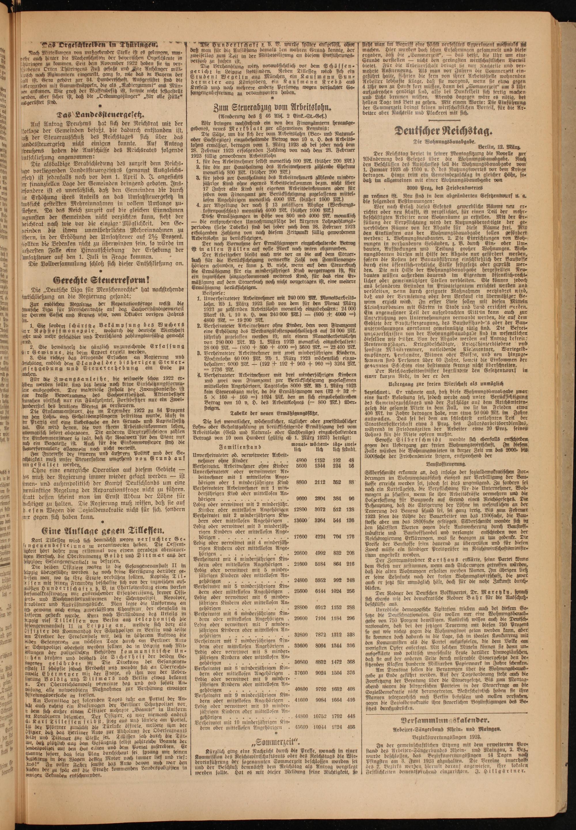 3. Verheirateter Arbeitnehmer mit zwei minderjährigen Kindern. Wochenlohn 60 000 Mk. Ab 1. März 1923 wöchentlich einzu⸗ e Mk.—(192 + 192 + 960 + 960) 3264 Mk. 2736