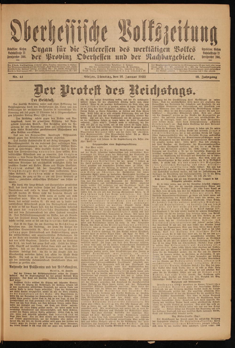 Gießen, Dienstag, den 16. Januar 1923