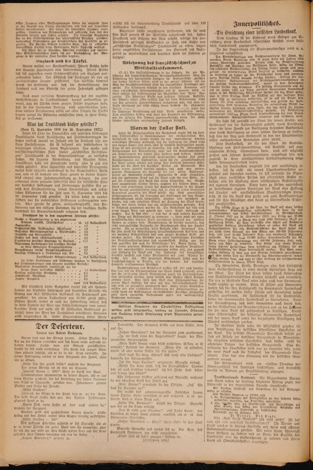 Mit Einschluß dieser Ausgaben ergibt sich als Gesamt— summe der deutschen Leistungen und staatlichen Verluste ein Betrag von 56,5 Milliarden Goldmark(in Papiermark um— gerechnet bei einem Dollarstand von 20 000 gleich 282½ Billion Mark), wobei es noch der Feststellung bedarf, daß in diese Summe der Wert von Elsaß-Lothringen(von ameri— kanischer Seite auf mehr als 20 Milliarden Goldsrancs ge— schätzt) sowie der Wert der Deutschland entrissenen Kolonien