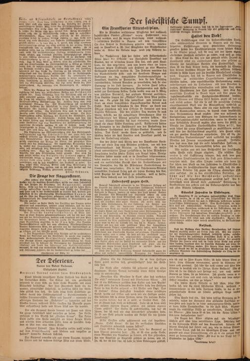 Vor der Fahrt nach Mainz war der Frankfurter Kreis⸗ leiter auf einen Tag nach München gefahren, um mit dem Bundesvorstand das Attentat zu besprechen. Er mußte jedoch unverrichteter Dinge zurückkehren, da seine Münchener Vorgesetzten bereits hinter Schloß und Riegel saßen. Wenige Stunden später wurde auch er in Frankfurt festgenommen; dabei wurden unter den bei ihm beschlagnahmten Papieren auch ein ausführlicher Bericht über die Verhandlungen mit den Franzosen, der für die Münchener Bundesleitung be⸗ stimmt war, vorgefunden. Ein in das Scheidemann Attentat verwickelter Leutnant Heinz gab als letzten Ausweg den Rat, selbst Anzeige bei der Polizei zu erstatten, weil er hoffte, man könne dadurch aus der Falle herauskommen.