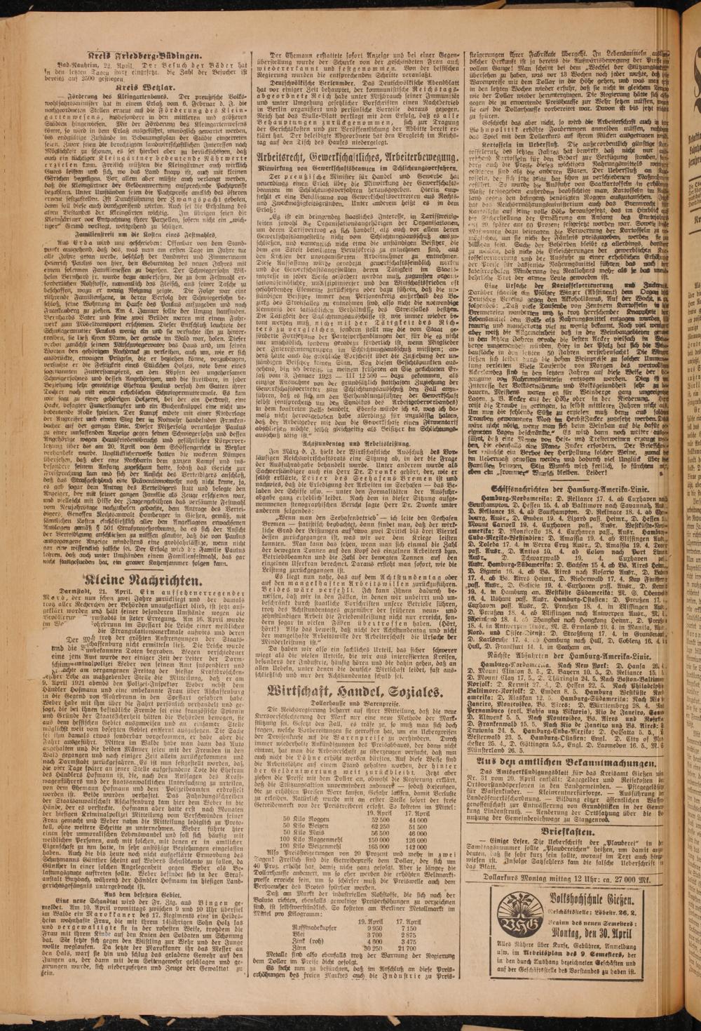 Das Amtsverkündigungsblatt für das Kreisamt Gießen Nr. 31 pom 20. April enthält: Tagegelder und Reisekosten Ortsvorstandspersonen in den Landgemeinden.— Pflegegeld für Watsenkinder.— Kleinrentnerfürsorge.— Ausführung Landesfeuerlöschordnung.— Bildung einer öffentlichen Wasst genossenschaft zur Entwässerung von Grundstlitken in der Ge kung Lindenstruth.— Aenderung der Ortssatzung über die nutzung der Gemeindeviehwage zu Stangen