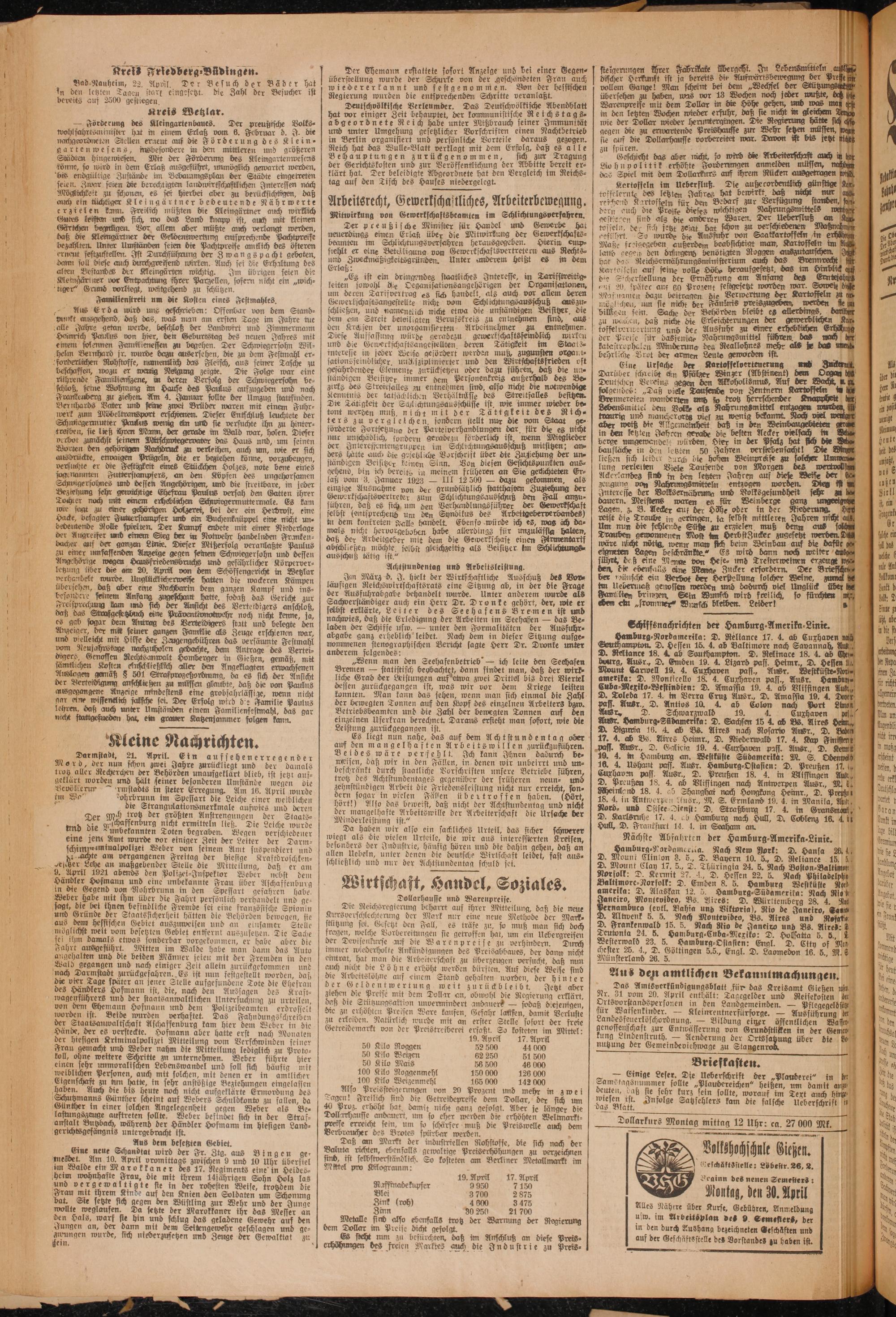** 7* Kleine Nachrichten. Dar instadt, 21. April. Ein aufsehenerregender Mord, der nun schon zwei Jahre zurlickliegt und der damals trotz aller Recherchen der Behörden unaufgeklärt blieb, ist jetzt auf⸗ geklärt worden und hält seiner besonderen Umstände wegen die Bevöllerur— rmstadts in steter Erregung. Am 16. April wurde im Wo“ dohrbrunn im Spessart die Leiche einer weiblichen 5 die Strangulationsmerkmale aufwies und deren Der Mech trotz der größten Anstrengungen der Staats⸗ 157 5 Vächafsenburg nicht ermitteln ließ. Die Leiche wurde und die unbekannten Toten begraben. Wegen verschiedener eine jene Amt wurde vor einiger Zeit der Leiter der Darm— schimperminalpolizei Weber von seinem Amt suspendiert und chte am vergangenen Freitag der hiesige Kraftdroschken⸗ Mitteilung, daß er am Weber nebst dem Händler Hofmann und eine unbekannte Frau fiber Aschaffenburg in die Gegend von Rohrbrunn in den Spessart gefahren habe. Weber habe mit ihm über die Fahrt persönlich verhandelt und ge⸗ sagt, die bei ihnen befindliche Fremde sei eine französische Spionin 180 Gründe der Staatssicherheit hätten die Behörden bewogen, sie au i