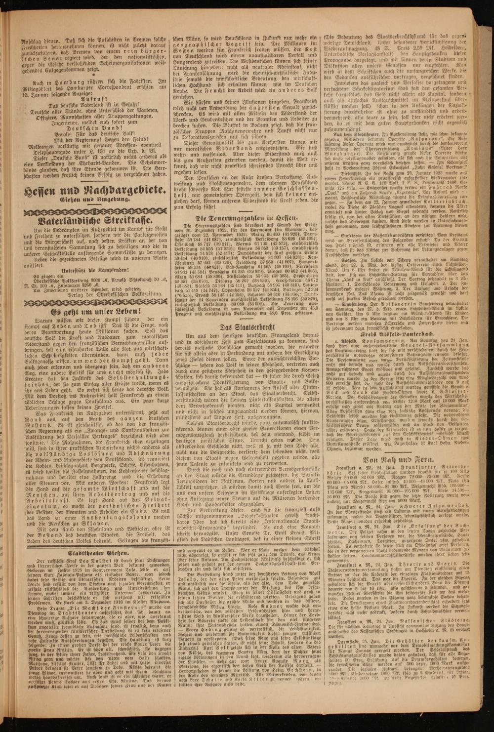 Den Deutschen an der Ruhr drohen Verhaftung, Aus⸗ weisung und Maschinengewehre, dem übrigen Deutschland droht schwerste Not. Nur festeste innere Geschlossen⸗ heit, nur gemeinsamer Opfergeist. dem sich keiner ent⸗ ziehen darf, können unserem Widerstand die Kraft geben, die zum Erfolg führt. Die Teuerungs zahlen in Hessen.