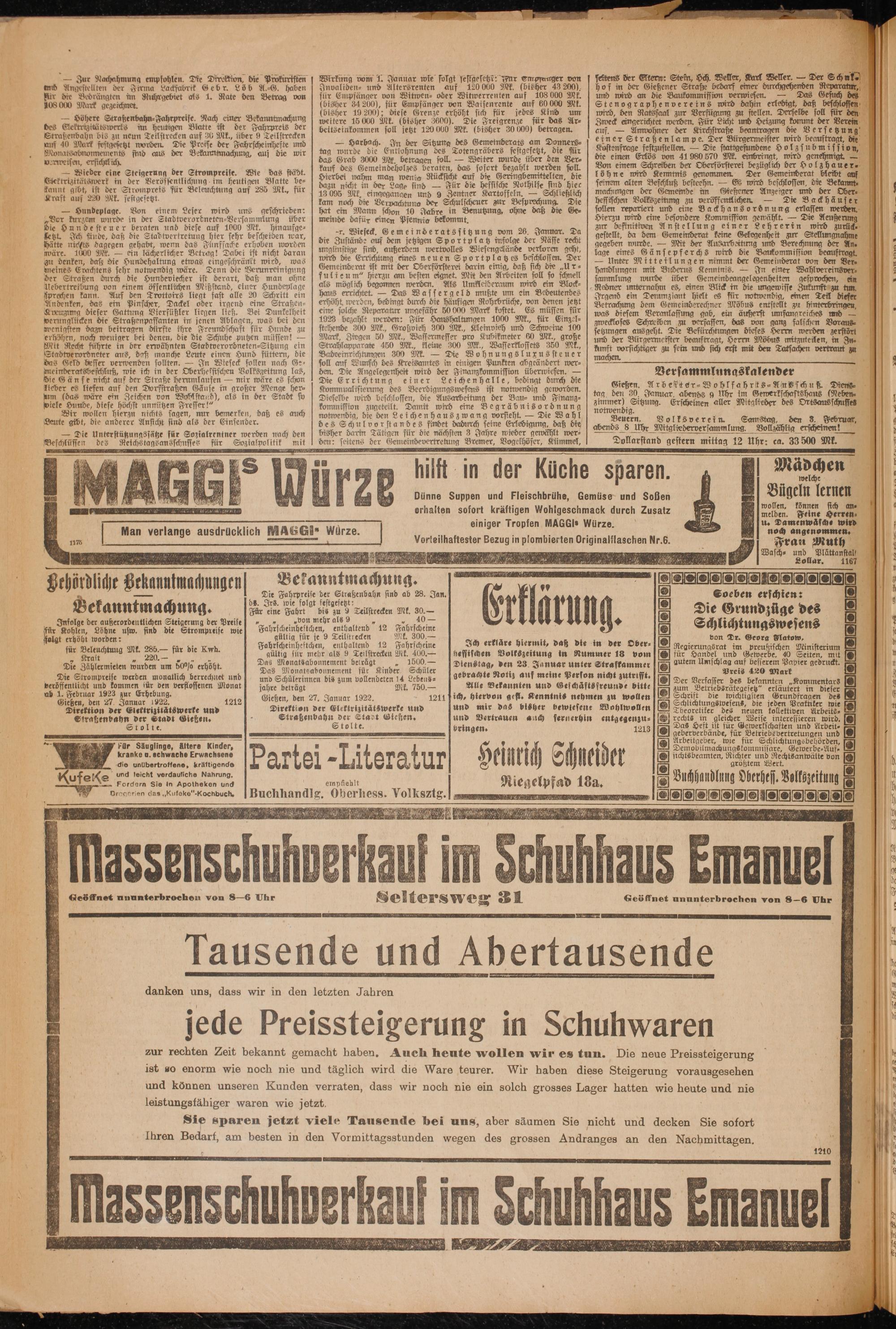 57 ung vom 1. Januar wie folgt festgesetzt: ler, Karl Weller.— Der Schule — Nachahmun len. Die Diroktion, die Prokuristen] Wirkung vom 1. Januar wie folgt sestgesetzt: Fur empfauger von] seitens der Eltern: Stein, Hch. We ad 1 1 der. Gebr. Löb 25 haben[ Invaliden⸗ und Altersrenten auf 120 000 Mk.(bisher 43 200).[hof in der Gießener Straße bedarf einer e Gerne, Fur die Bedrängten im Ruhrgebiet als 1. Rate den Betrag von für Empfänger von Witwen⸗ oder Witwerrenten auf 108 000 Mk. und wird an die Baukommission verwiesen.— esuch des 108 000 Mark gezeichnet.(bisher 34 200), für Empfänger von e— 90 Ml. wand, 56g 8 wird 1 5 u. Bense en 1 a bis 19 200); diese Grenze erhöht sich für jedes um wird, de erfügung en. Ders — Höhere Straßenbahn⸗Fahrpreise. Nach einer Bekanntmachung e 15000 Mt(bisher 3600) Hie Freigrenze für das Ar⸗ Zweck eingerichtet werden. Für Licht und Heizung kommt der Vereim des Geltrizitätswerls im heutigen Blatte ist der F eis der beitseinkommen soll jetzt 120 000 Mk.(bisher 30 000) betragen. auf.— Amwohner der Kirchstraße beantragen die Versetzung Straßenbahn bis zu neun Teilstrecken auf 30 Mk., über 9 Teilstrecken 508 Gemen d da n einer Straßenlampe. Der Bürgermeister wird beauftragt, die nuf 40 Mark festgesetzt worden. Die Preise der Fahrscheinhefte und 70. 5 55 E 2 5 räbers festgesetzt, die für] Kostenfrage festzustellen.— Die stattgefundene Holzsubmission, Monatsabnonnements find aus der Bekannmnachung, auf die wir] tag wurde die Entlohnung 0 ber den Ver. die einen Erlos von 41980570 Mk. einbringt, wird genehmigt.- wei chtlich e eee Von reiben der Oberförsterei bezüglich ber Holz haue r- e i 0 kauf des Gemeindeholzes beraten, das sosort bezahlt werden soll. einem Sch 5 9 f — Wieder eine Steigerung der Strompreise. Wie das städt. Hierbei nahm man wenie Rücksicht auf die Geringbemittelten, die löhne wird Kenntnis genommen. Der Gemeinderat bleibt auf Glektrizitätswerk in der Veröffentlichung im heutigen Blatte be- dazu nicht in n sind Für die hessische Nothilfe sind hiec seinem alten Beschluß besteehn.— Es wird beschlossen die Bekannt⸗ f kannt gibt, ist der Strompreis für Beleuchtung auf 285 Mk., für 1 8 7 Kartoffeln.— Schließlich machumgen der Gemeinde im Gießener Anzeiger und der Ober⸗ 11 Kraft auf 220 Mk. festgeseczt tan nach pig Geraete der Schulschener ul Pesprechung ie beseachen Veltsde weng zu weroffentichen— Die Bad häufe?? — Hundeplage. Von einem Leser wird uns geschrieden: hat ein Mann schon 10 Jahre in Benutzung, ohne daß die Ge⸗ sollen repariert 0 95 8 0. fen 9* Uu.. 2 Ae 1 ‚ 58 kurzem wurde in der e ee e 100 9 über meinde dafür einen Pfennig bekommt. e 1 1 Leb rerin 19110 urid. ie Hundesteuer beraten und diese auf 1 hinaufge⸗ 27. Wieseck. Gemeinderatssitzung vom 26. Jannar. Da e 8 e ei ches dagegen gehade wenn das Flffaltg erhohen werder ole Jusskrb ein den fed van Spo rtefa mei ber due rect beheben wuahe. e J der Ars rbekkrng ure Serge der Bi, f 9 8 1500 Mk.— 8 erde e it nicht daran] unglinstige sind, außerdem wertrolles Wiesengelände verloren geht, lage eines Gänsepferchs wird die Baukommission beauftragt. 2 u denken, daß die Hundehaltung etwas eingeschränkt wird, was wird die Errichtung eines neuen Sportplatzes beschlossen. Der]— unter Mitteilungen nimmt der Gemeinderat von den Ver⸗ 115 Beine Erachtens sehr notwendig wäre. Denn die Verunrefnigung] Gemeinderat ist mit der Oberförsterei darin einig, daß sich die Ur e] handlungen mit Bidderus Kenntnis.— In einer Wahlvereins ve. der Straßen durch die Hundeviecher ist derart, daß man ohne[sulieum“ hierzu am besten eignet. Mit den Arbeiten soll so schnell[ sammlung wurde über Gemeindeangelegenheiten gesprochen, n Uebertreibung von einem öffentlichen Mißstand, einer Hundeplage als möglich begonnen werden. Als Umkleideraum wird ein Block-] Redner unternahm es, einen Blick in die ungewisse Zukunft zu mw sprechen kann. Auf den Trottoirs liegt fast alle 20 Schritt ein haus errichtet.— Das Wassergeld mußte um ein Bedeutendes] Irgend ein Dewmzjant hielt es für notwendig, einen Teil diefe: Andenken, das ein Pinscher. Dackel oder irgend eine Straßen erhöht merden, bedingt durch die häufigen Rohrbrüche, von denen jetzt Betrachung dem Gemeinderechner Möbus entstellt z urs eng. Kveuzung dieser Gattung Vierfüßler liegen ließ. Bei Dunkelheit[eime solche Reparatur ungefähr 50000 Mark kostet. Es müssen für] was diesem Veranlassung gab, ein äußerst umfangreiches und 1 verungliicken die Straßenpassanten in jenen Ablagen, was bei den[1923 bezahlt werden: Für Haushaltungen 1000 Mk., für Einzels] zweckloses Schreiben zu verfasfen, das von gang falschen Voraus. wenigsten dazu beitragen dürfte ihre Freundschaft für Hunde zu stehende 30⁰ Mk., Großvieh 300 Mk., Kleinvieh und Schweine 100 setzungen ausgeht. Die Befürchtungen dieses Herrn werden zerstört 0 erhöhen, noch weniger bei denen, die die Schuhe putzen müssen!—] Mark, Ziegen 50 Mk. Wassermesser pro Kubikmeter 60 Mk. große und der Blirgermeister beauftragt, Herrn Möbus mitzuteilen, in In- Mit Recht führte in der erwähnten Stadtverordneten⸗Sitzung ein[ Strahlapparate 450 Mk. kleine 300 Mk., Wasserklossets 350 Mk., kunft vorsichtiger zu sein und sich erft mit den Tatsachen vertraut zu Stadtverordneter aus, daß manche Leute einen Hund füttern, die[Badeeinrichtungen 300 Mk.— Die Wohnungsluxussteuer machen. 5 9 das Geld besser verwenden sollten.— In Wieseck sollen nach Ge- soll auf Wunsch des Kreisamtes in einigen Punkten abgeändert wer⸗ ö 2 einderatsbeschluß, wie ich in der Oberhessischen Volkszeitung las, den. Die Angelegenheit wird der Finamzkommission überwiesen.— Versammlungskalender 1 Bie G n fe aich auf ber Straße herumlaufen— mir wäre es schon[Die Errichtung einer Leichenhalle, bedingt durch die Gießen. Arbelter⸗Wohlfahrts⸗Augschu k. Dies lieber es liefen auf den Dorfstraßen Gänse in großer Menge her⸗ Kommualisierun