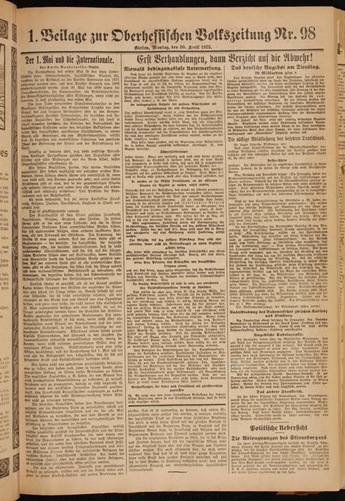 wir uns jedoch die Dinge näher an. Gewiß besteht bei uns eine Schwäche, die ich nicht unterschätze insofern, als wir nirgends an der Macht sind und überall nur eine Opposition bilden, und zwar eine solche, die nicht immer sehr einflußreich ist. Aber andererseits besitzen wir eine Stärke, die auf die Dauer unbesiegbar werden kann: die Einigkeit der Arbeiter ⸗ Hassen gegenüber den gespaltenen Regierungen. Die inter⸗ tionale Arbeiterschaft ist sich einig, wenn nicht über alle Einzelheiten eines Planes der Reparationen und der inter⸗ nationalen Sicherheit, so doch über die Grundsätze der not⸗ 1 7 5 Vereinbarungen. Allerdings würde dieses grund⸗ satzliche Einvernehmen, das übrigens in den jüngsten Zu⸗ sammenkünften erfreulich vervollständigt wurde, wenig be⸗ deuten, wenn nicht unserem gemeinsamen Willen eine ge⸗ meinsame Aktion folgte. Glücklicherweise wird eine solche Aktion beabsichtigt, und die Kundgebung des 1. Mai soll für suns alle die Gelegenheit sein, festzustellen, daß sie sich mit steigender Kraft und Entschlossenheit fortsetzen wird.