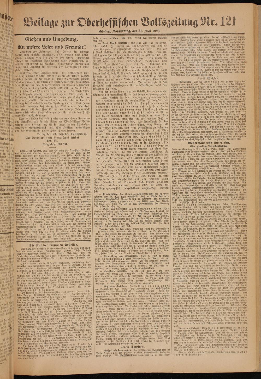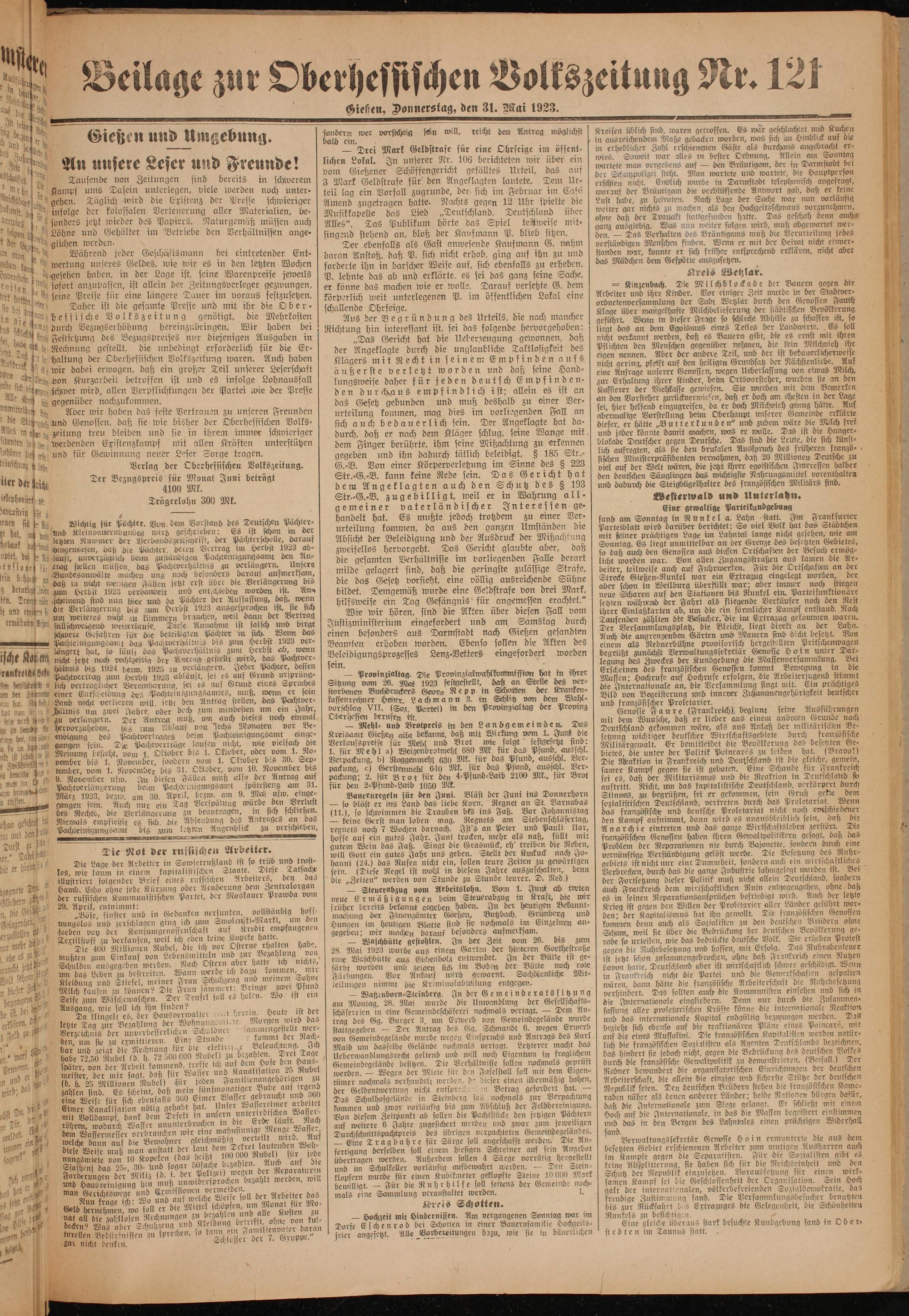 Wie wir hören, sind die Akten über diesen Fall vom Justizministerium eingefordert und am Samstag durch einen besonders aus Darmstadt nach Gießen gesandten Beamten erhoben worden. Ebenso sollen die Akten des Beleidigungsprozesses Lenz⸗Vetters eingefordert worden sein. g — Provinzialtag. Die Provinzialwahlkommissiom hat in ihrer Sitzung vom 26. Mai 1923 festgestellt, daß an Stelle des ver⸗ storbenen Buchdruckers Georo Repp in Schotten der Kranken⸗ kassenrechner Heinr. Lachmann 3. in Schlitz von dem Wahl⸗ vorschlag VII.(Soz Partei) in den Provinzialtag der Proving Oberhessen berufen ist.