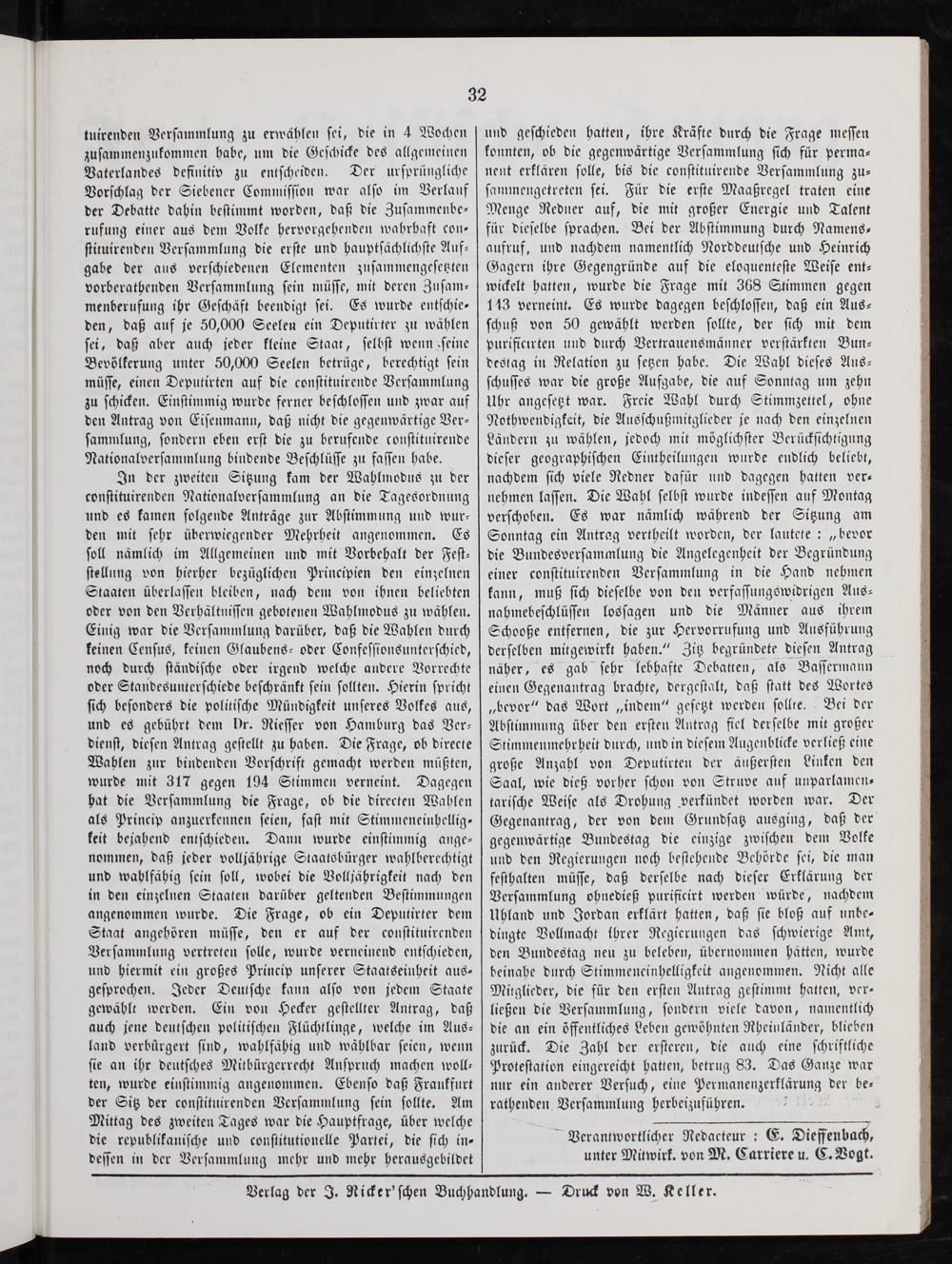 tuirenden Versammlung zu erwählen sei, die in 4 Wochen zusammenzukommen habe, um die Geschicke des allgemeinen Vaterlandes definitiv zu entscheiden. Der ursprüngliche Vorschlag der Siebener Commission war also im Verlauf der Debatte dahin bestimmt worden, daß die Zusammenbe— rufung einer aus dem Volke hervorgehenden wahrbaft con— stituirenden Versammlung die erste und hauptsächlichste Auf— gabe der aus verschiedenen Elementen zusammengesetzten vorberathenden Versammlung sein müsse, mit deren Zusam— menberufung ihr Geschäft beendigt sei. Es wurde entschie— den, daß auf je 50,000 Seelen ein Deputirter zu wählen sei, daß aber auch jeder kleine Staat, selbst wenn eine Bevölkerung unter 50,000 Seelen betrüge, berechtigt sein müsse, einen Deputirten auf die constituirende Versammlung zu schicken. Einstimmig wurde ferner beschlossen und zwar auf den Antrag von Eisenmann, daß nicht die gegenwärtige Ver— sammlung, sondern eben erst die zu berufende constituirende Nationalversammlung bindende Beschlüsse zu fassen habe.